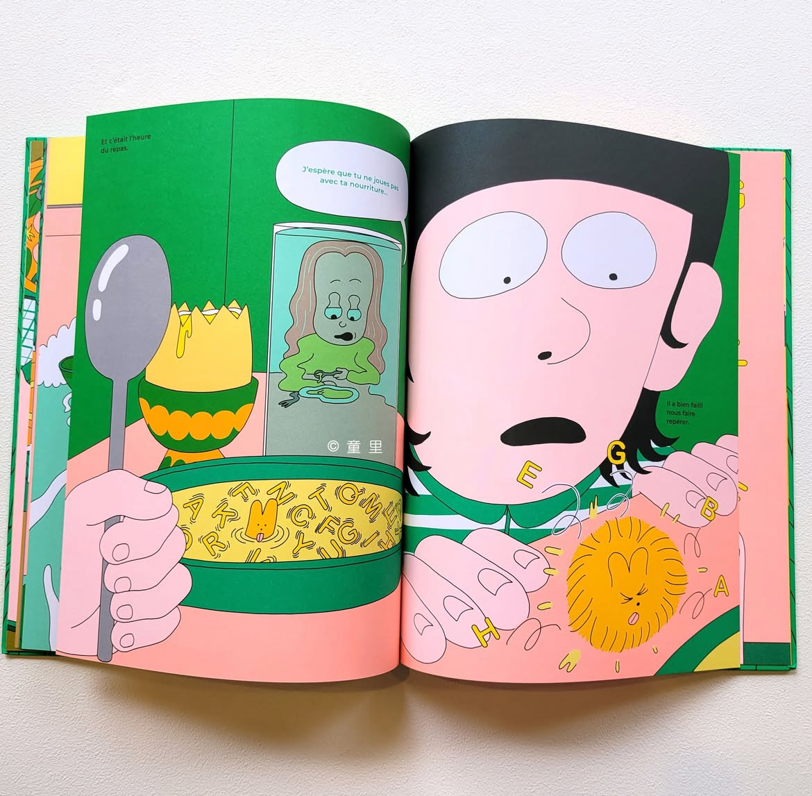 Son chien, bondissant avec des yeux ronds et un sourire presque enfantin, accentue la portée comique et pédagogique du récit. Les couleurs vives, les expressions exagérées et les scènes improbables montrent l’esprit joyeux et burlesque de son univers.
