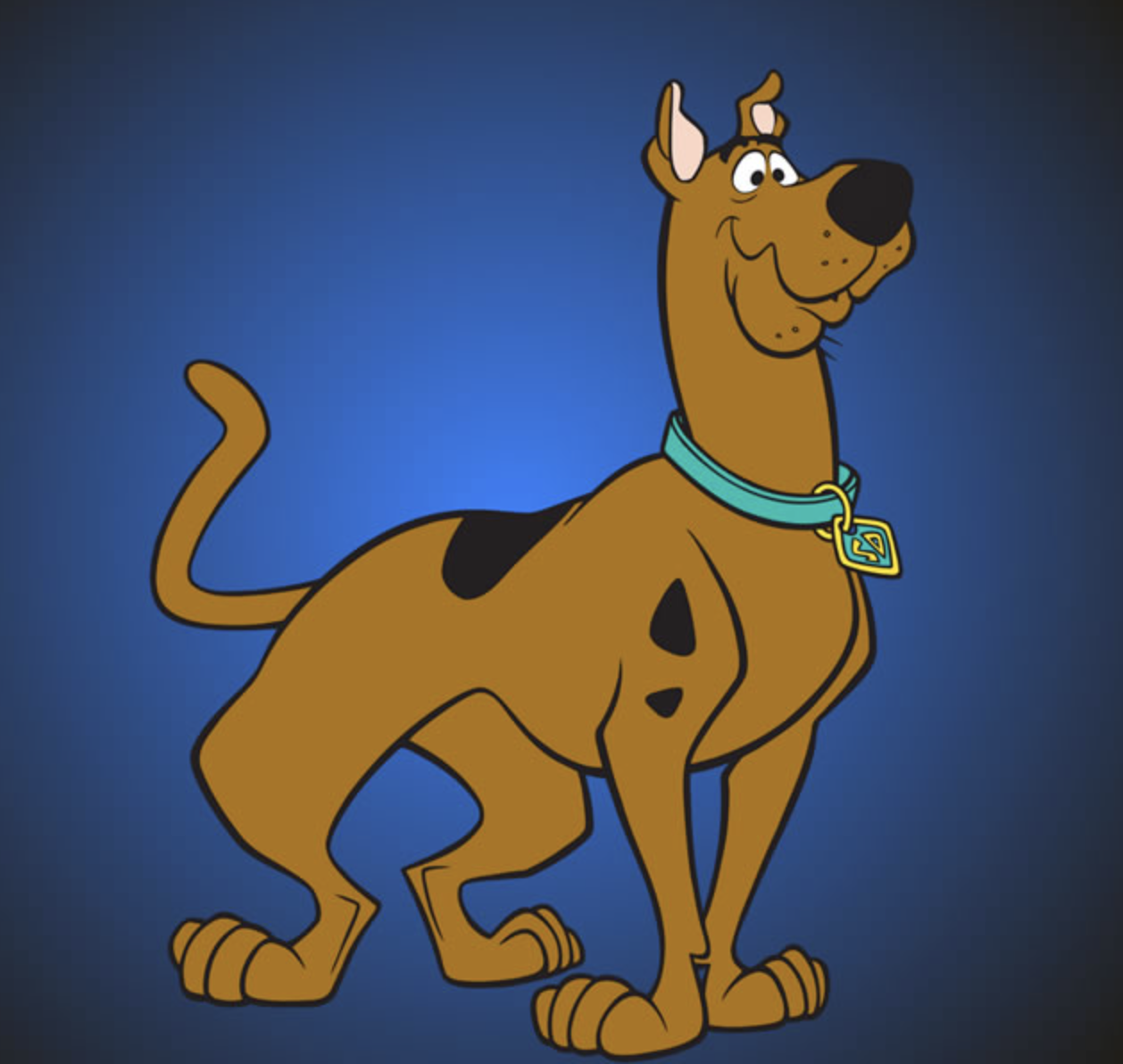 Scooby-Doo, Where Are You!, personnage conçu par Iwao Takamoto, 1969, pour Hanna-Barbera Productions. Ces attitudes corporelles, combinées à son langage comique et à son ton jovial, font de lui un personnage profondément humain, drôle et attachant.
