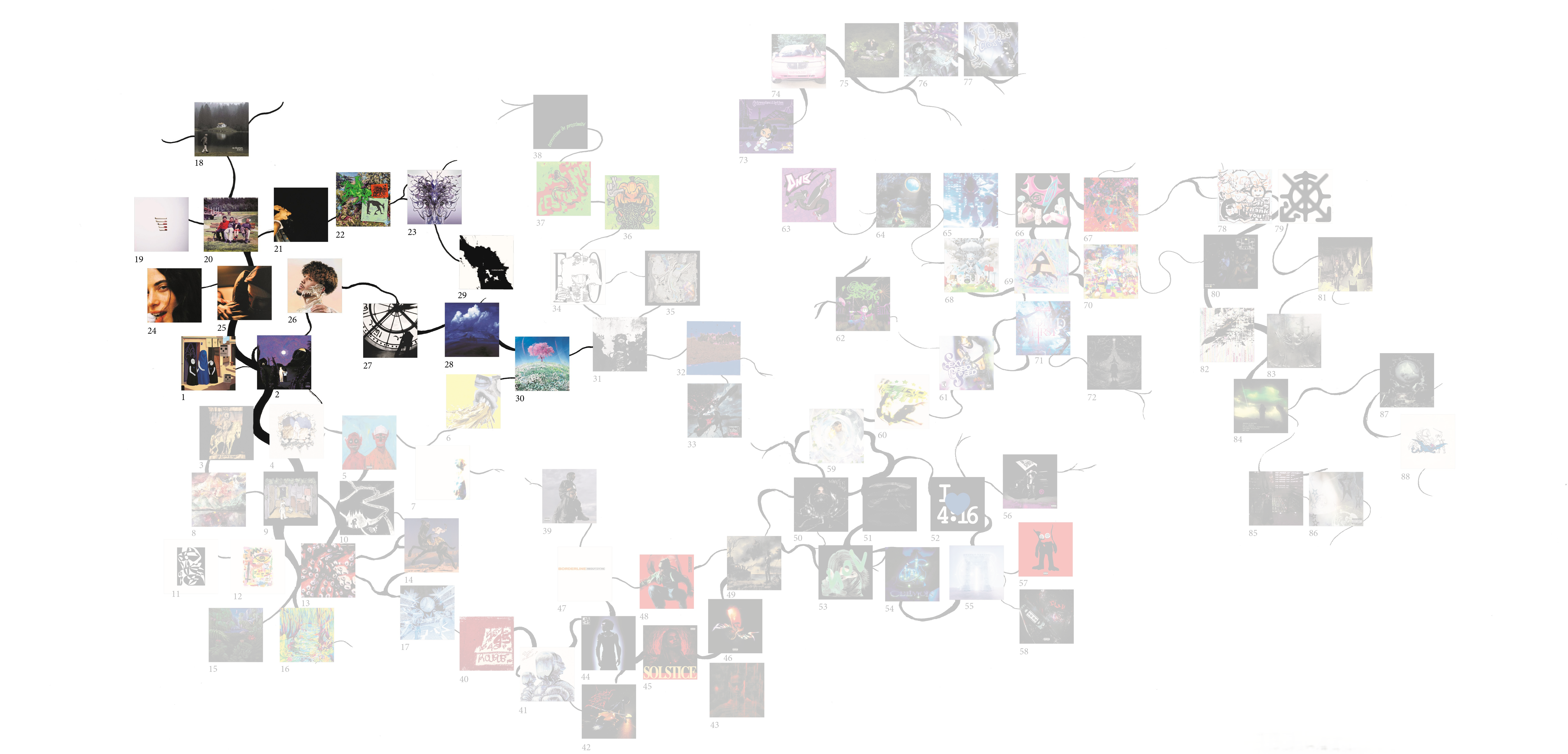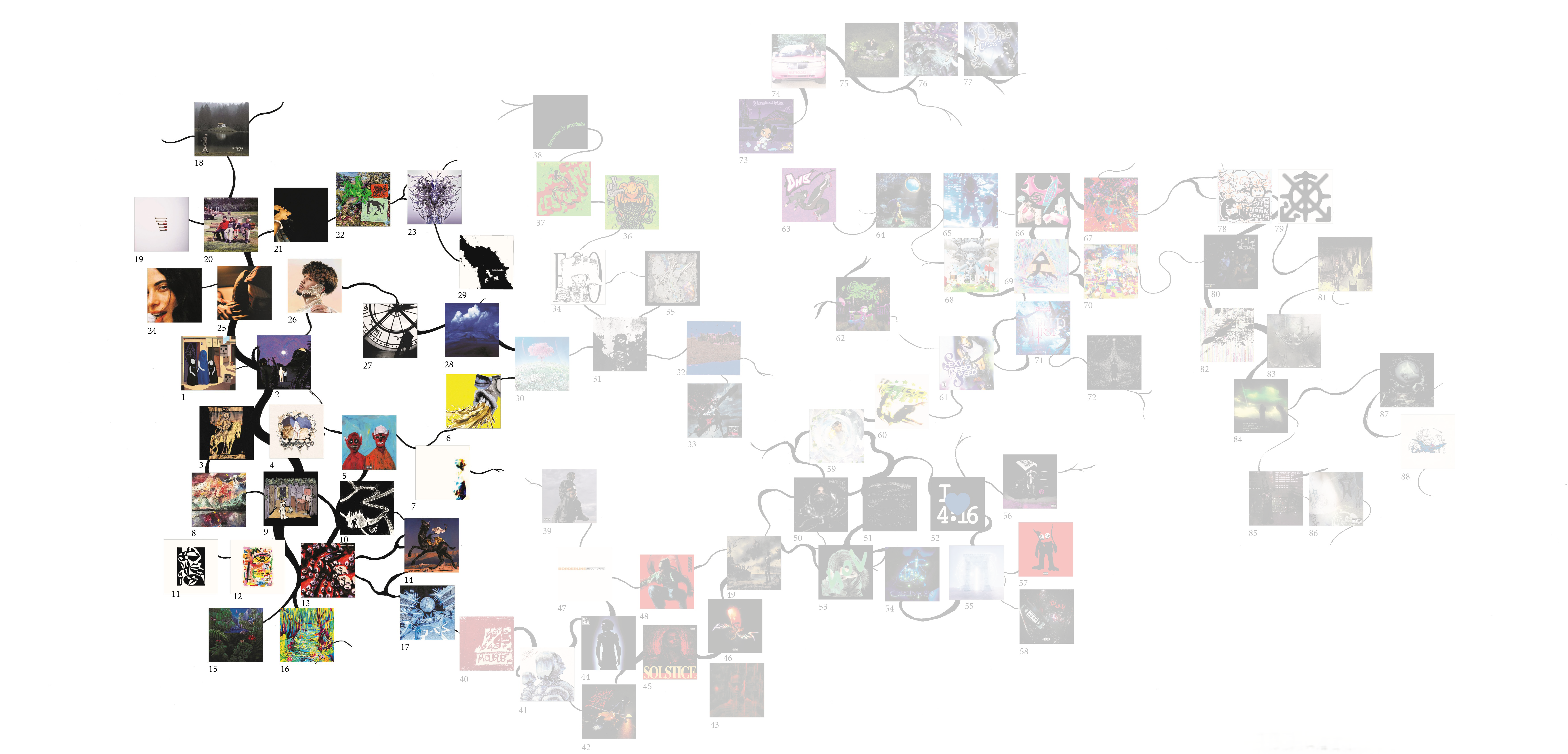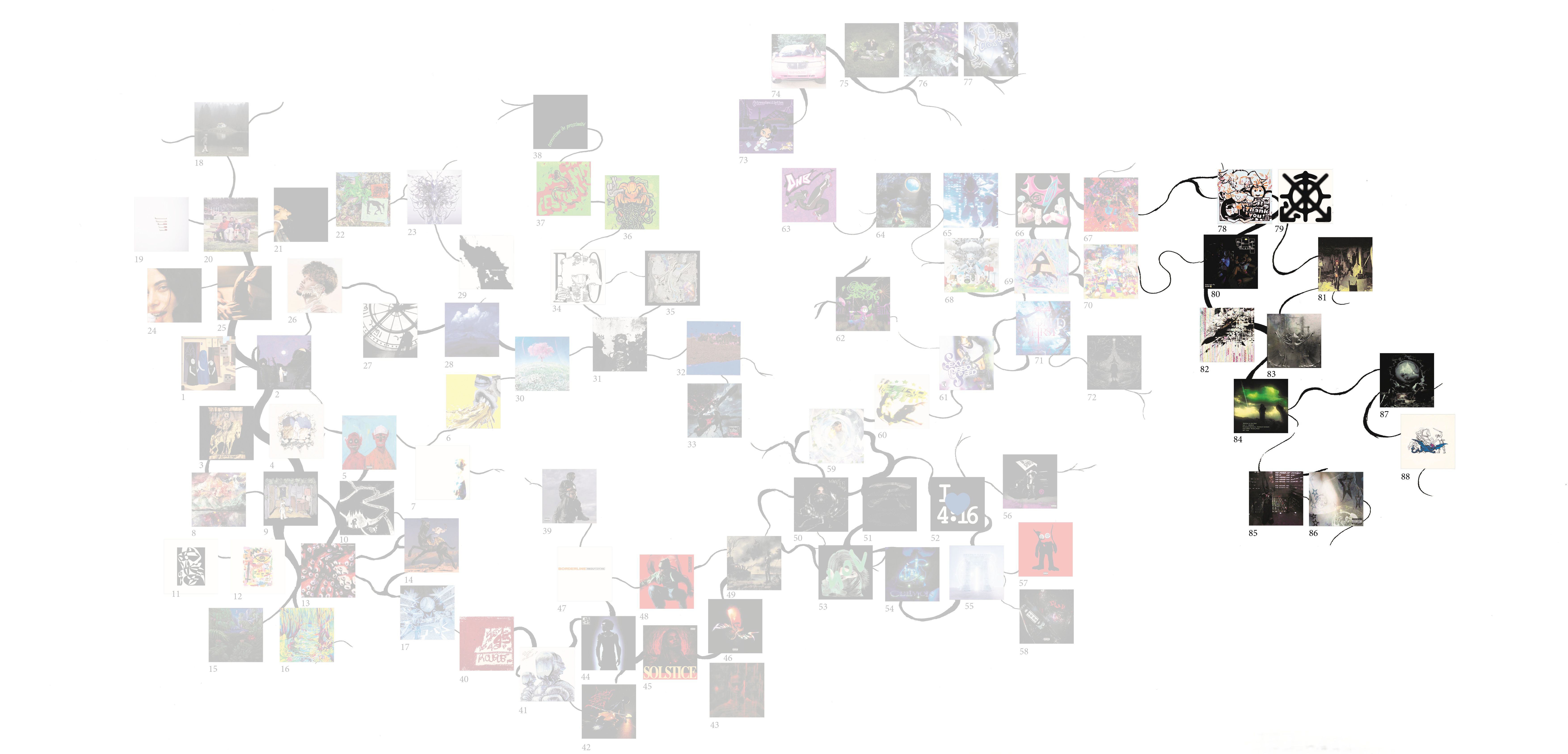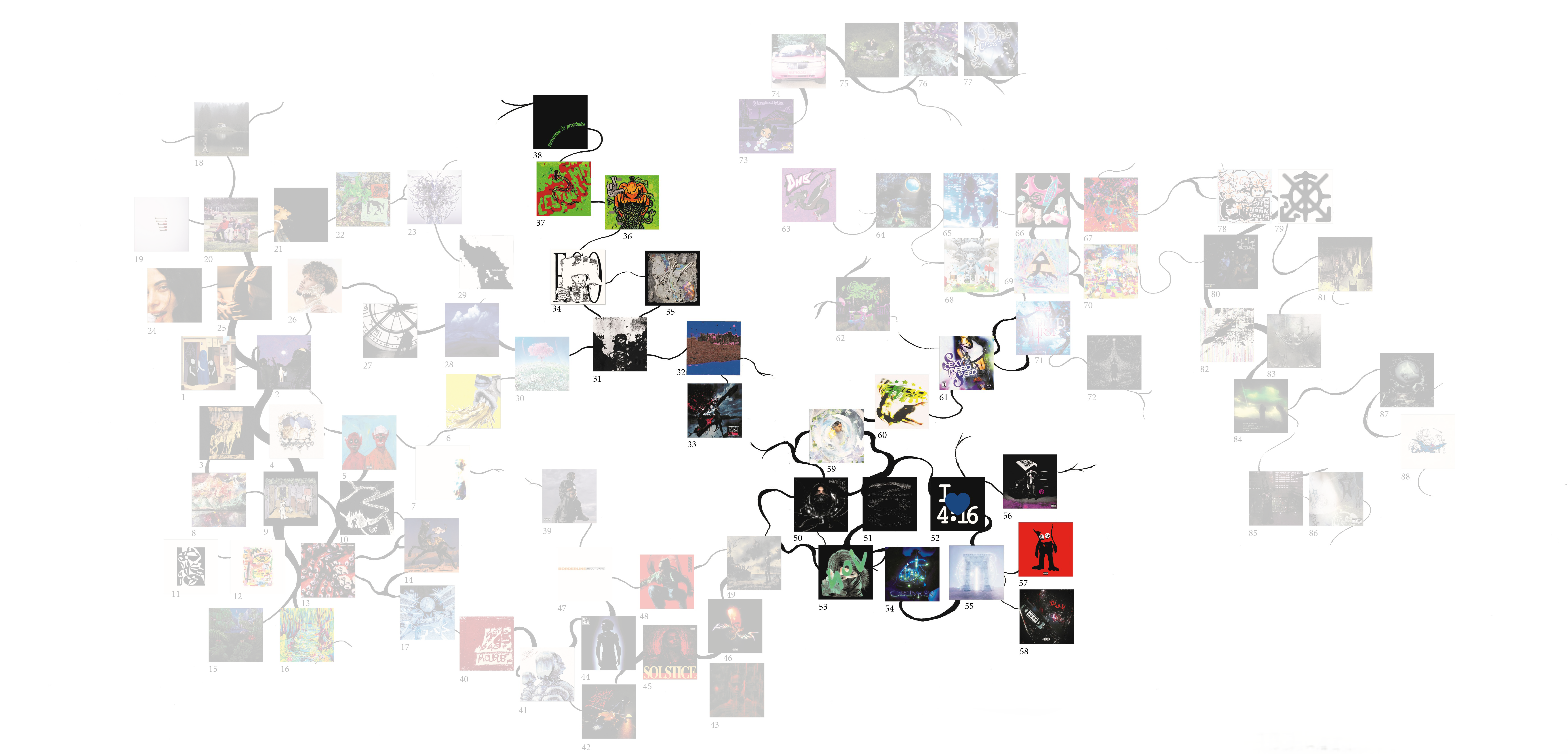 Ce mémoire vise à explorer les relations entre design graphique et musique indépendante, en recentrant le corpus sur la scène rap underground française. Celle-ci, très prolifique, est surtout remarquable par ses différentes façons d’associer imagerie et musicalité. De ces associations naissent des sous-genres, qui évoluent et développent chacun leur esthétique et leurs codes musicaux et visuels, particulièrement par l’usage des technologies numériques. J’ai ainsi réalisé une carte permettant de naviguer plus facilement dans ce réseau dense, tentaculaire, et qui structure en partie l’argumentation.