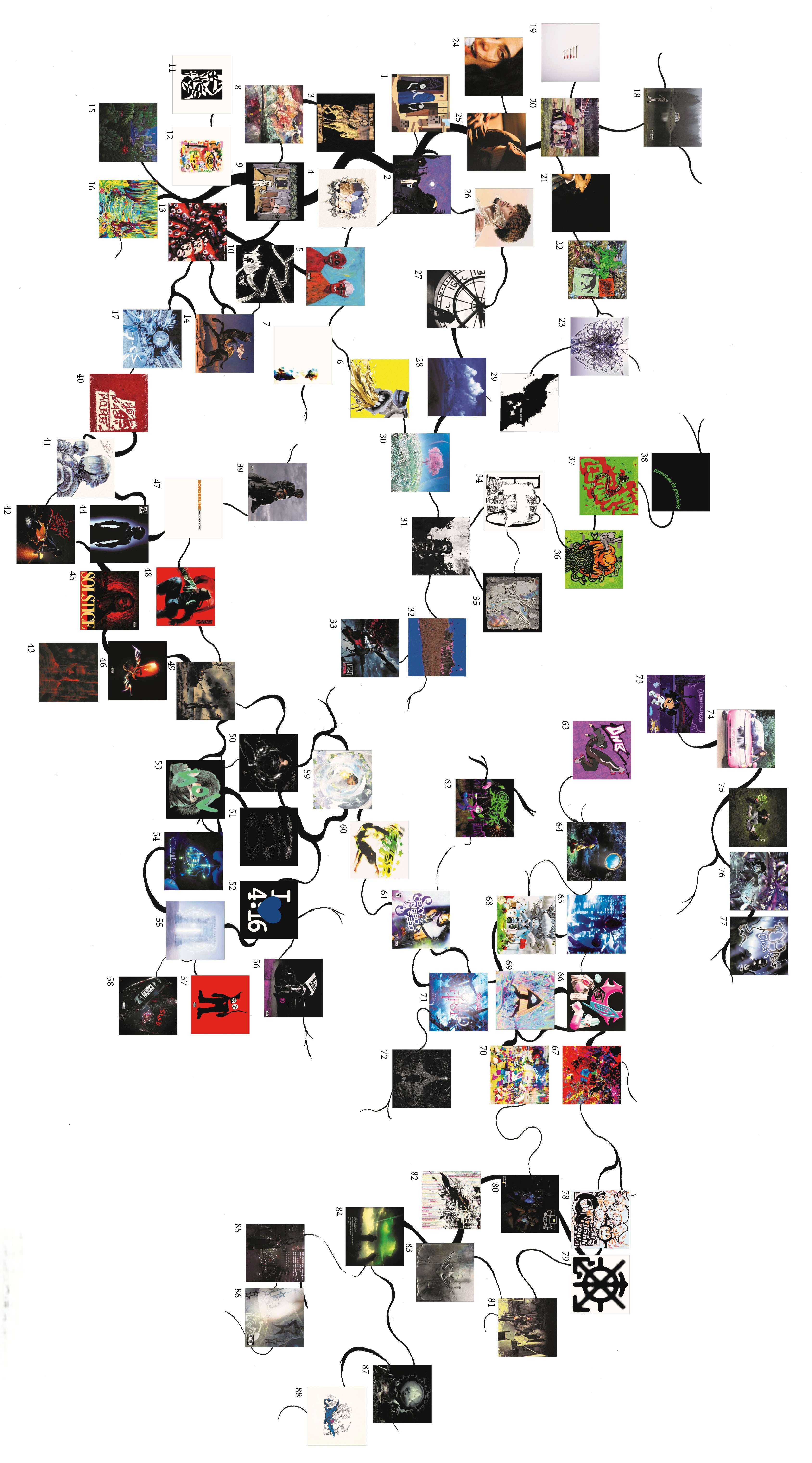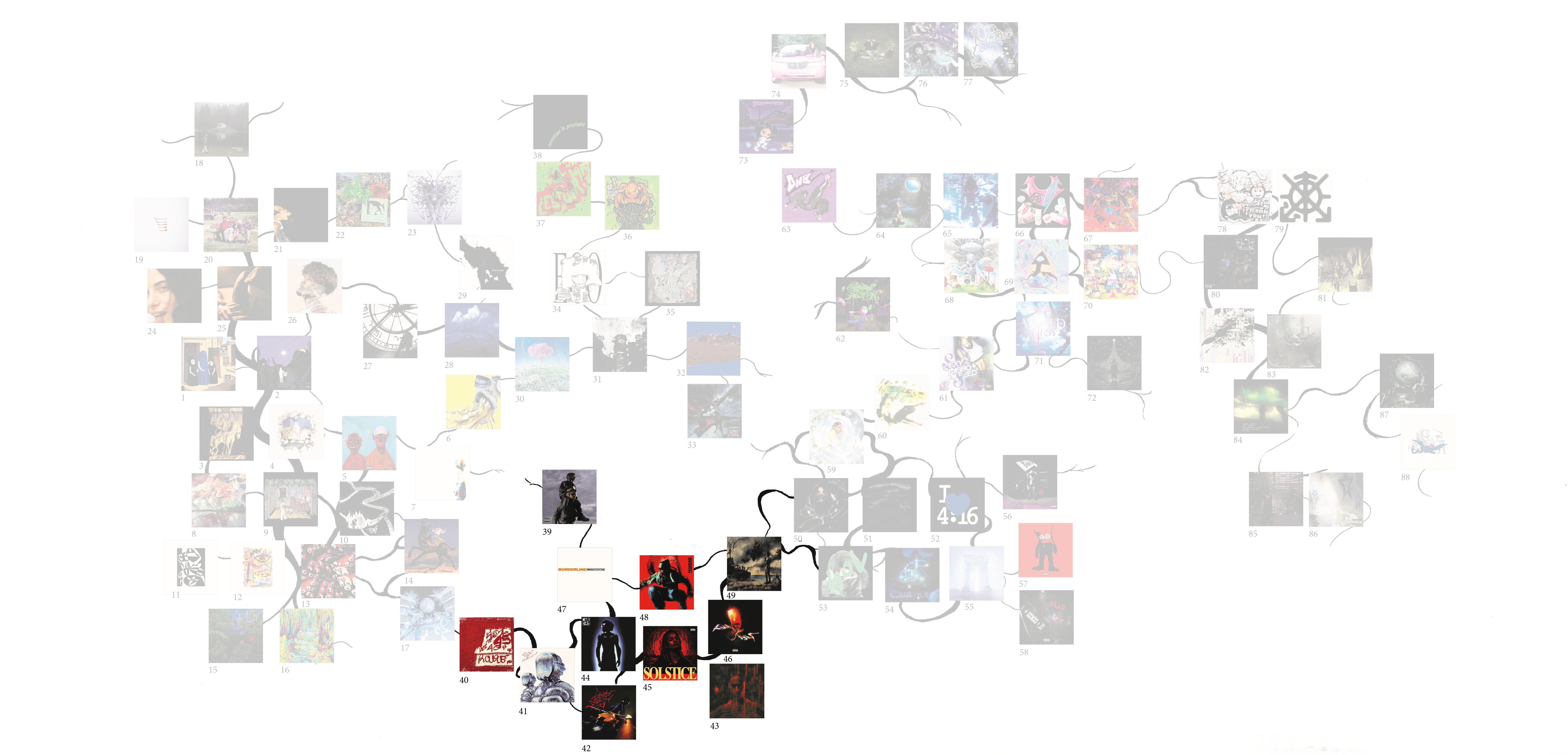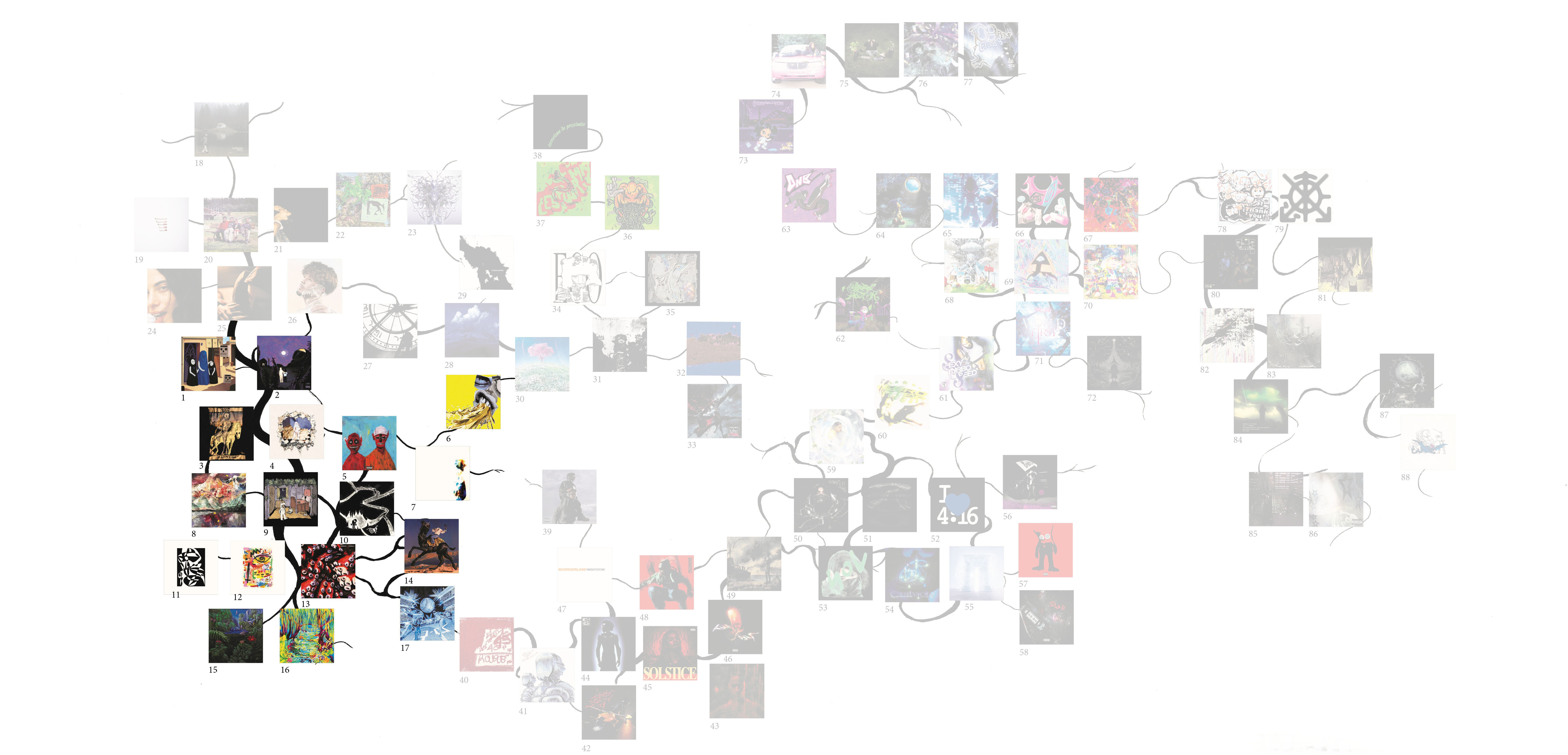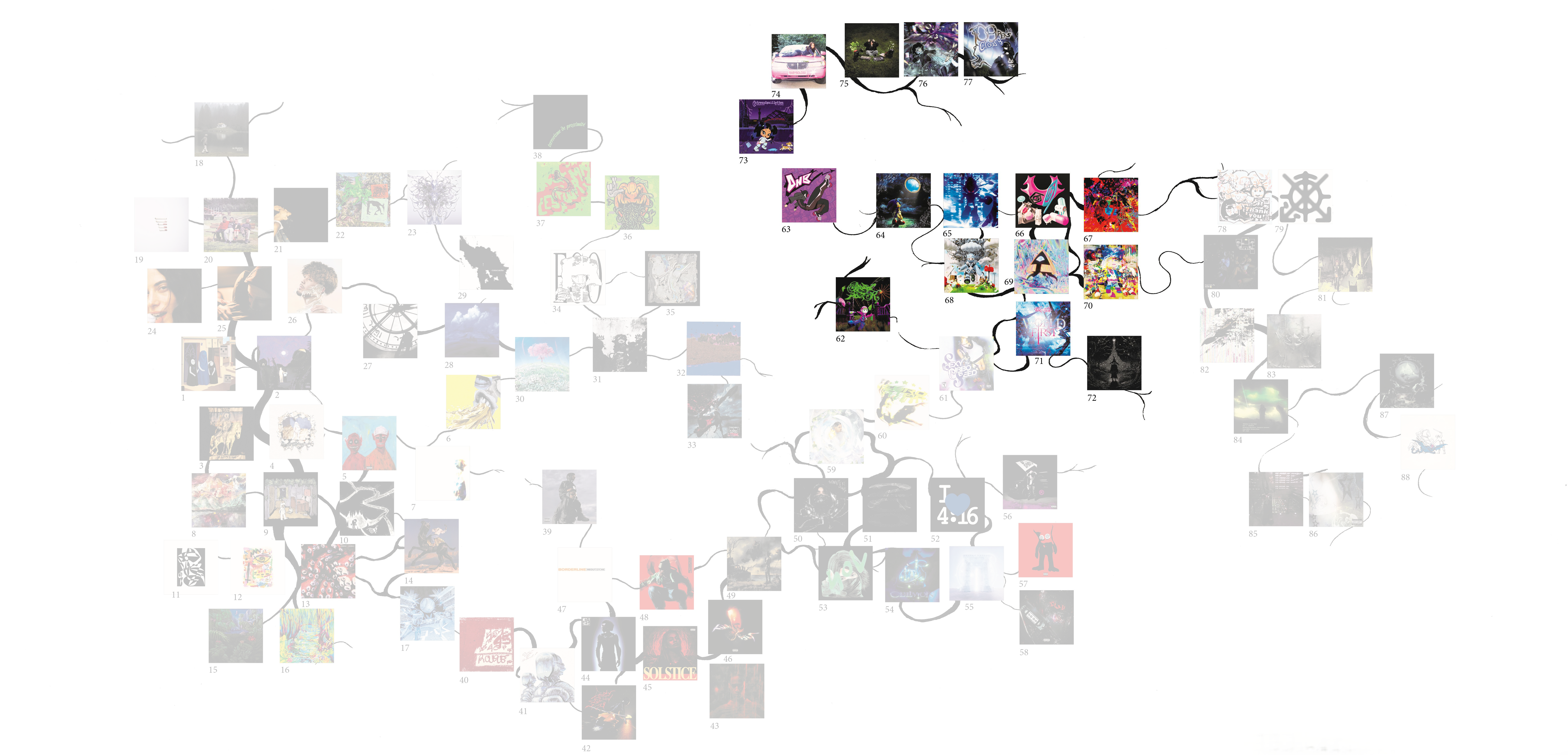Ce mémoire vise à explorer les relations entre design graphique et musique indépendante, en recentrant le corpus sur la scène rap underground française. Celle-ci, très prolifique, est surtout remarquable par ses différentes façons d’associer imagerie et musicalité. De ces associations naissent des sous-genres, qui évoluent et développent chacun leur esthétique et leurs codes musicaux et visuels, particulièrement par l’usage des technologies numériques. J’ai ainsi réalisé une carte permettant de naviguer plus facilement dans ce réseau dense, tentaculaire, et qui structure en partie l’argumentation.