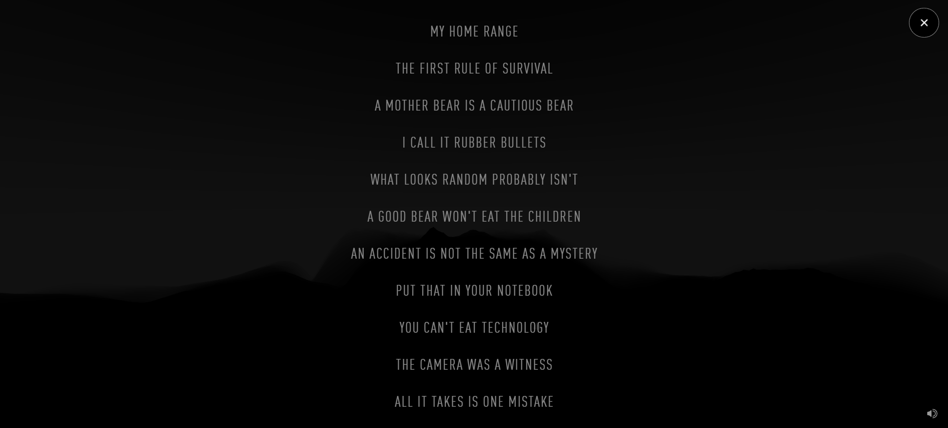 Une session dure environ trente minutes, dans le cas où le spectateur décide de suivre le grizzly et de ne pas interrompre l’enchainement des audios. Il est aussi possible de revenir sur un audio[fig. 11], ou bien d’explorer la réserve pour prolonger l’expérience. Si le spectateur décide d’explorer la réserve, il pourra interagir avec pleins d’autres espèces (animaux, végétaux)Capture d’écran de The Bear 71. ou même avec des infrastructures qui sont signifiées par des pictogrammes.