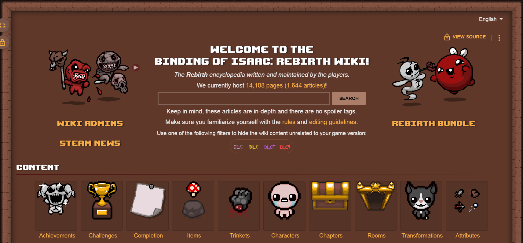 page d’accueil du wiki de Binding of Isaac: Rebirth créé et entretenu par des joueurs, sortit en 2011.