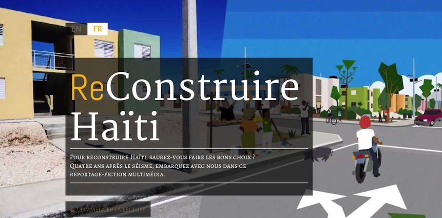 Écran d’accueil du webdocumentaire ReConstruire Haïti, réalisé par The Pixel Hunt et Florent Maurin en 2014.