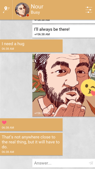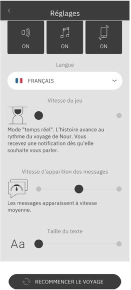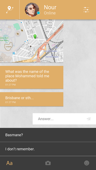 Il est intéressant de noter que le jeu prend le parti-pris de briser une règle implicite du monde du jeu vidéo : Le joueur n’a pas à aller vers le jeu, mais c’est au jeu d’aller vers le joueur. Généralement, les jeux cherchent à captiver, immerger le joueur dans leurs récits pour cela ils développent alors un environnement via l’interface le gameplay, etc. Leur objectif est donc de stimuler le joueur pour qu’il reste le plus longtemps dans le jeu. Ici, lorsque vous jouez à Enterre moi mon amour vous pouvez décider parmi certaines options de gérer la fréquence à laquelle Nour va nous envoyer des SMS.