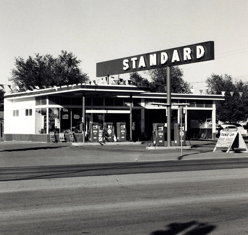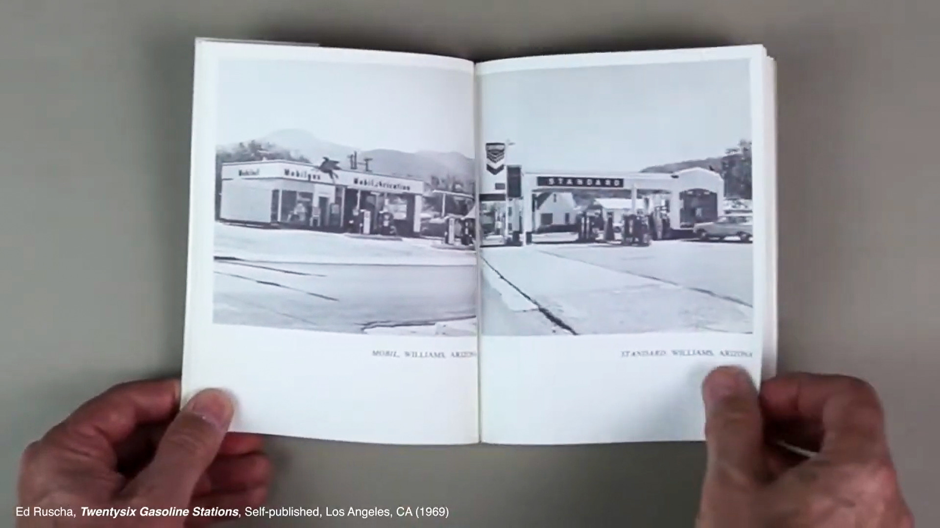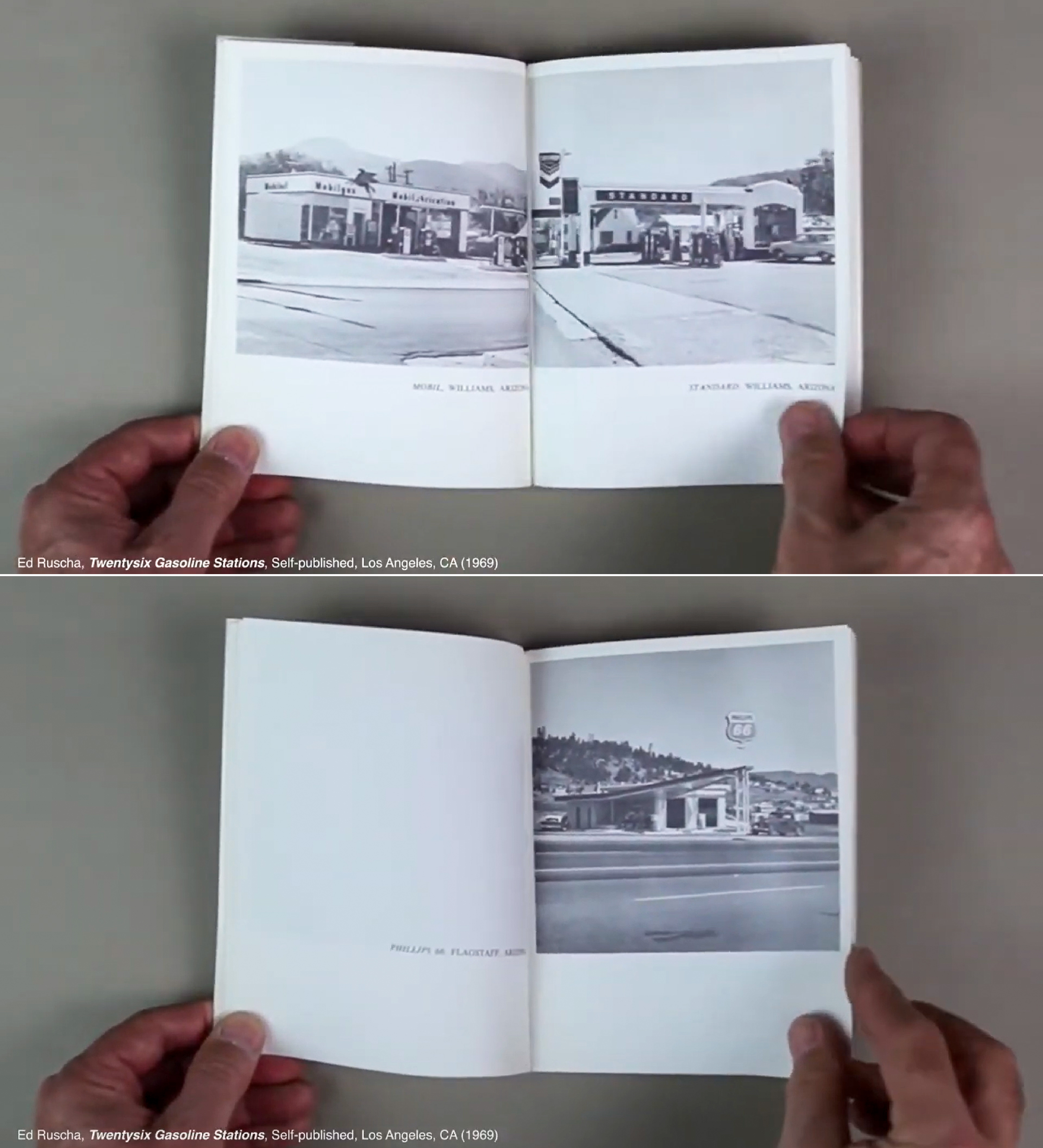 Twenty Gasoline Stations19, publié en 1963, est une série de photographies de stations essences toutes prises de la même manière : depuis l’autre côté de la route avec un appareil simple