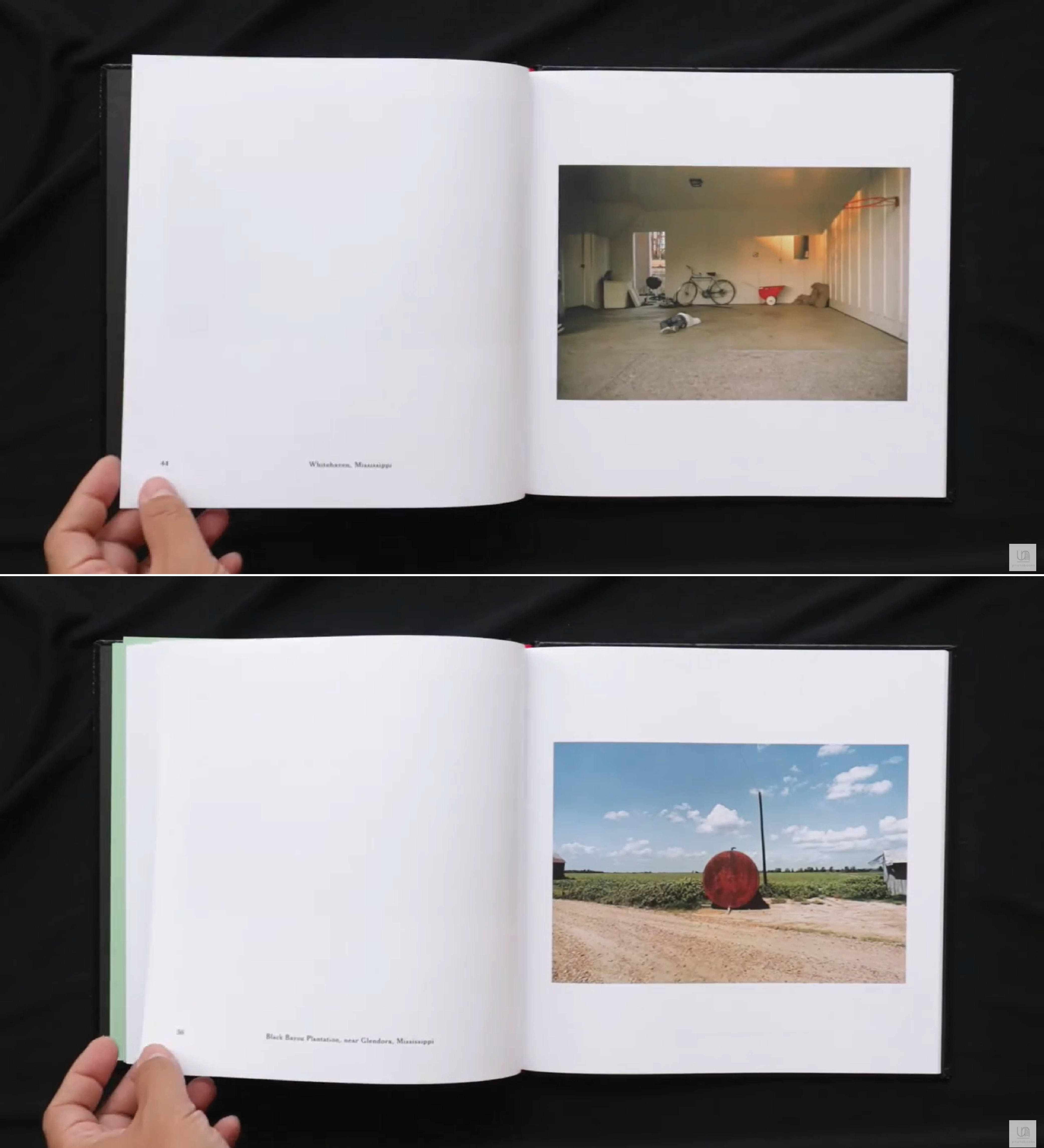 © EGGLESTON, William, Guide, Untitled. © Eggleston Artistic Trust., permet une lecture fluide. Les photographies sont présentées de manière égale, créant une rythmique constante, tandis que la disposition est soigneusement calibrée. La manière dont chaque photographie occupe un espace dédié sur chaque page évoque la forme d’un album tel qu’on le connaît, renforçant l’aspect personnel de l’ouvrage. Chaque image, bien que semblant anodine, devient une archive minutieuse d’un moment de l’histoire et de la culture américaine, transformée par la puissance de la couleur et de la composition. En intégrant un format plus petit comme Raymond Depardon l’a fait, Eggleston favorise une immersion dans le monde qu’il capture, tandis que la simplicité graphique de l’ouvrage lui permet de se concentrer pleinement sur la puissance évocatrice des images elles-mêmes. Ce format et cette présentation, inspirés par les codes de la photographie documentaire et influencés par le mouvement de la Nouvelle Objectivité, rendent le recueil à la fois un document historique et un objet esthétique qui incite à une réévaluation du recueil. Le recueil trouvera donc sa fonction par la démonstration de ce qui est perçu au-delà, transformant ainsi l’ouvrage en un reflet de notre monde intérieur, un guide pour observer la réalité sous un jour nouveau.