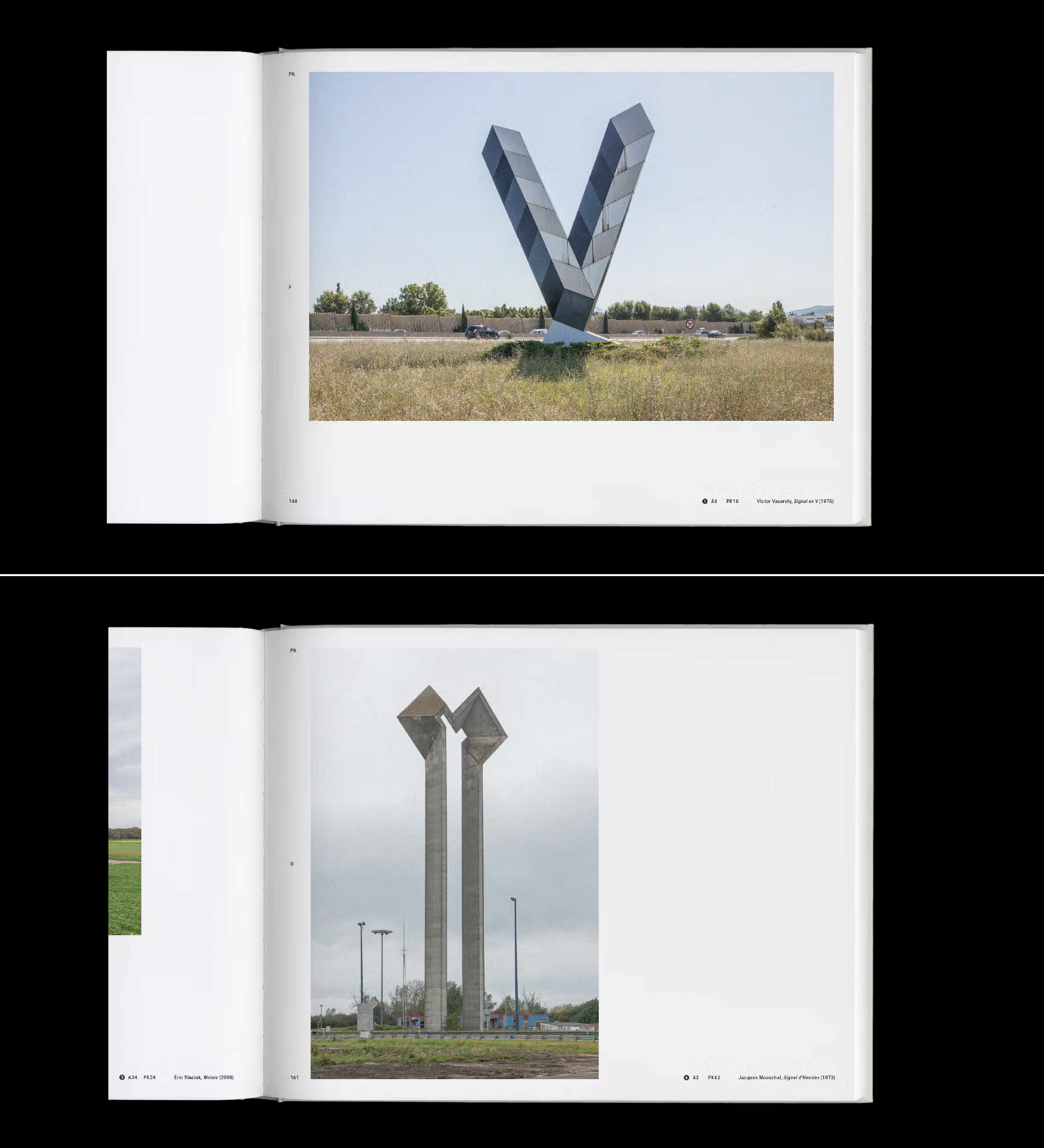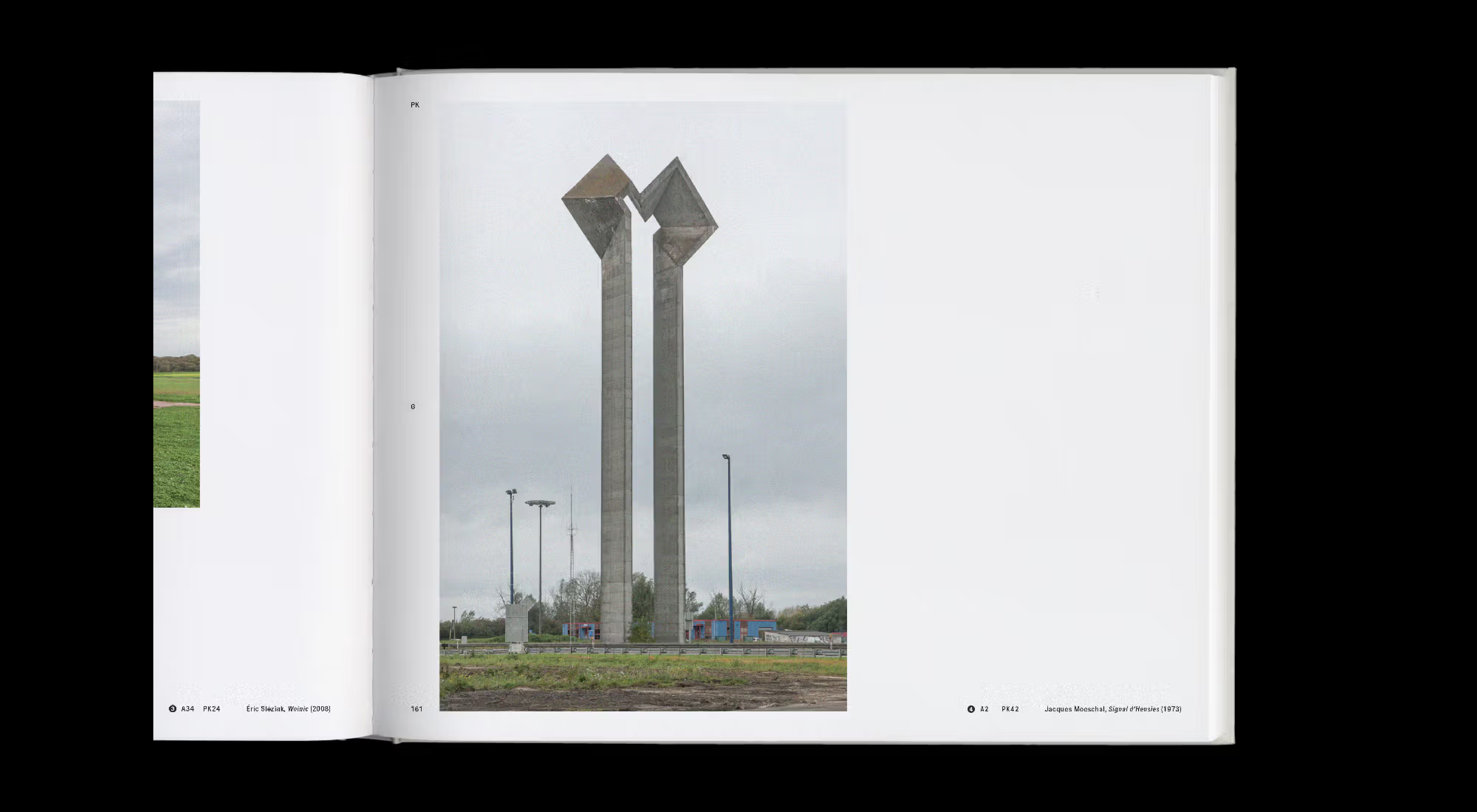 La nécessité de réinventer les codes se situe à un carrefour où dialoguent héritage et transformation. Dans l’exploration de nouveaux horizons, certains inscrivent leur travail dans l’interrogation continue de représentation des lieux. Mais alors est-ce que le photographe d’aujourd’hui réinvente les questions d’espace avec ce qu’il a en plus à disposition ? Des démarches comme celle de Julien Lelièvre ont des points communs avec les exemples de recueils précédents. Son projet Art d’autoroute31 repose sur un protocole de documentation qui s’étend sur dix ans et consiste à répertorier des œuvres d’art situées le long de douze itinéraires autoroutiers. Il propose lui aussi un éclairage unique sur les éléments visuels qui caractérisent ces œuvres, en particulier des ronds-points (ou dans leur environnement immédiat). Présentée au cœur du livre-photographique AA édité par Building Books, cette version papier met en lumière ces éléments souvent oubliés. Joëlle Zask souligne dans Du mouvement à l’action32, tiré de la dernière édition du photographe, que « même lorsqu’ils sont imposants, ils demeurent invisibles »