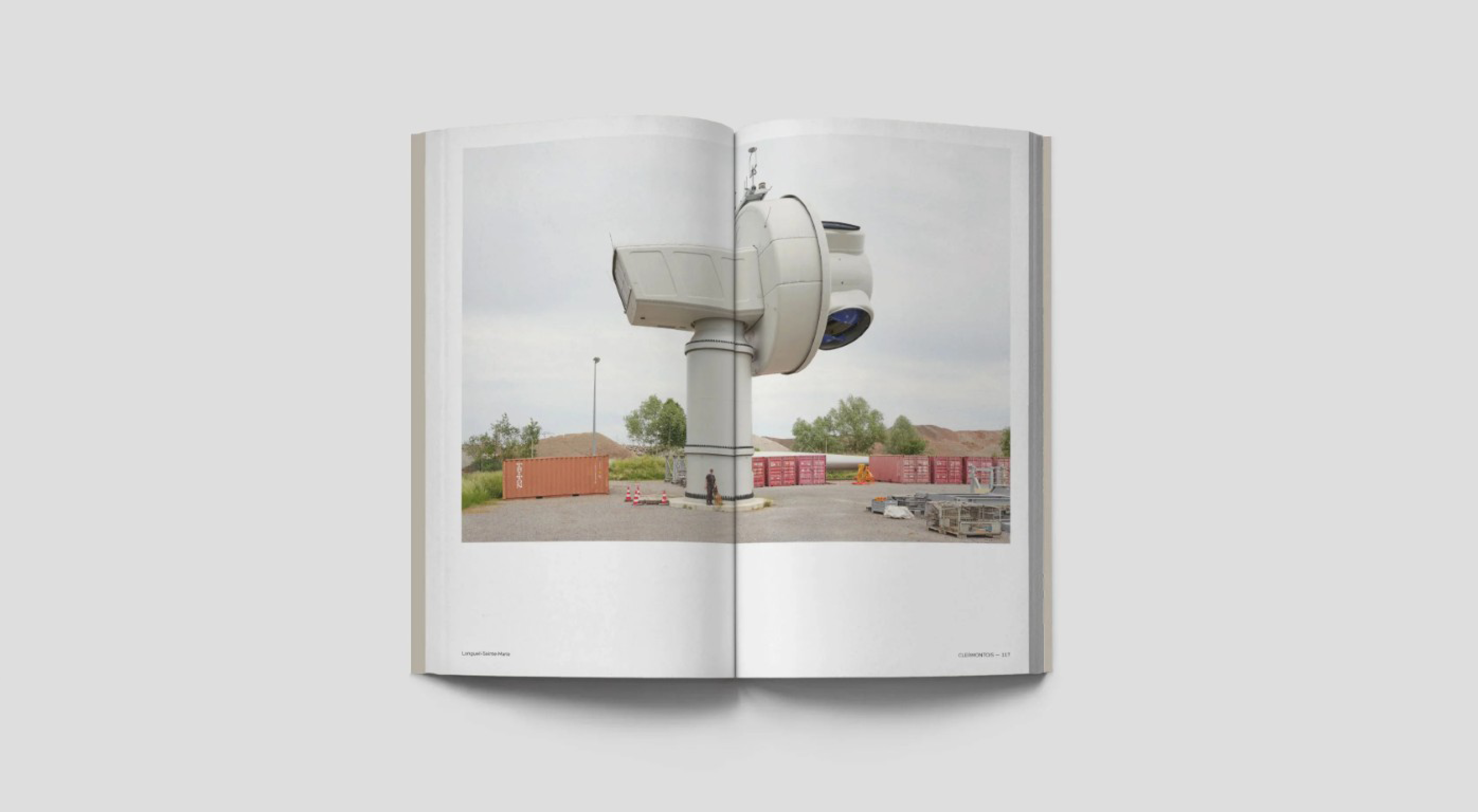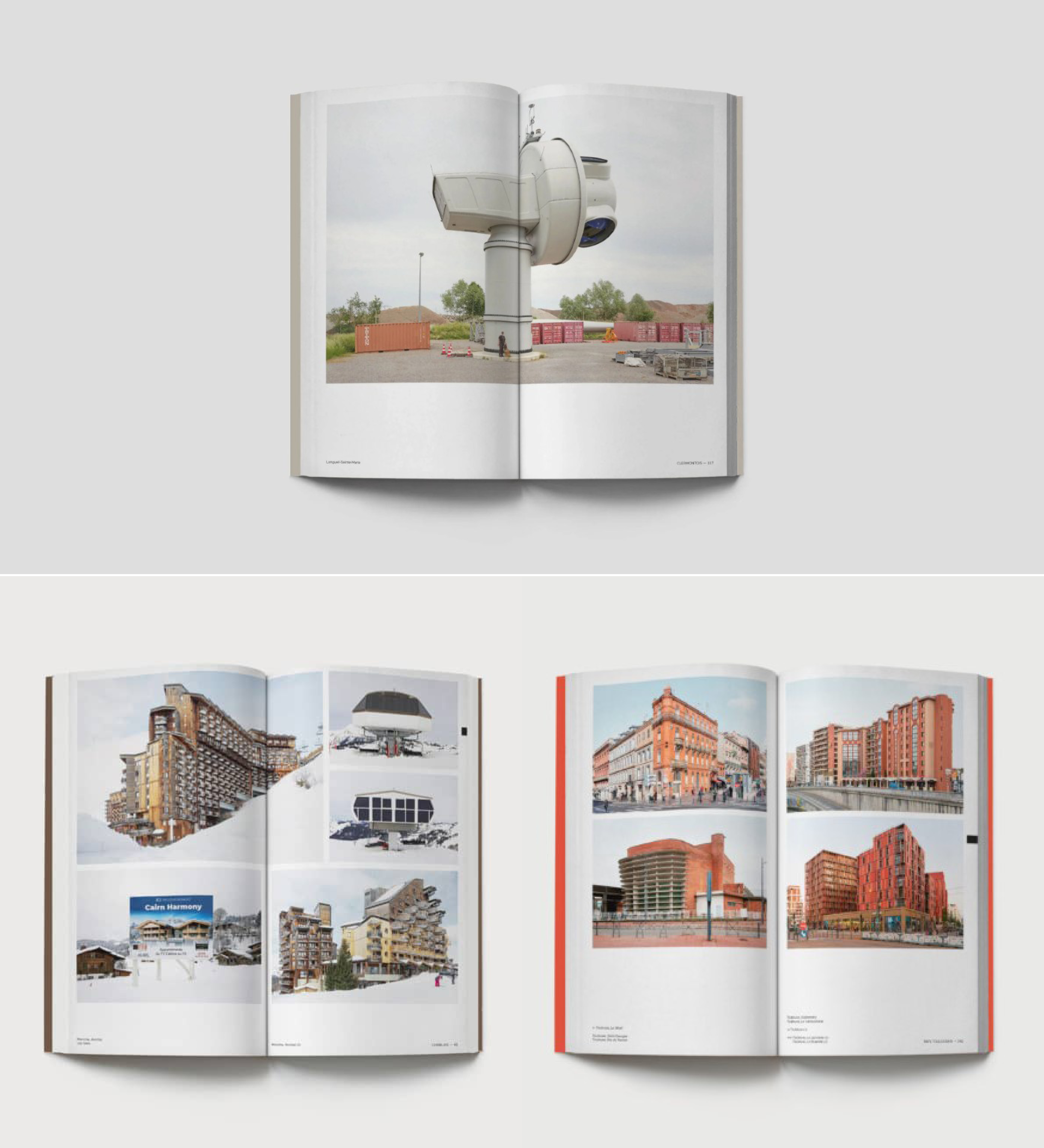 Ce recueil s’inscrit dans une tendance plus récente qui s’intéresse aux « non-lieux », espaces de transit et sans identité, concept développé par l’anthropologue français Marc Augé dans son ouvrage Non-lieux. Introduction à une anthropologie de la surmodernité (1992)34. Pour affirmer cette appartenance aux non-lieux, Building Books s’inspire des recueils d’auparavant : plans horizontaux délimités de marges qui dominent le livre. Ces photographies traduisent visuellement le sentiment d’un espace désincarné et utilitaire. Dans Art d’Autoroute, Julien Lelièvre capte la neutralité et la répétitivité des autoroutes en tant qu’espaces que l’on traverse indifféremment. Selon Marc Augé, les non-lieux renforcent l’individualisme moderne : on y passe seul, souvent coupé des interactions sociales significatives. Ainsi, la conception éditoriale transmet cette solitude par la mise en page simple : une voiture seule sur une route infinie, des parkings vides ou des panneaux suspendus au-dessus d’un horizon désert. Nous retrouvons sur certaines pages plusieurs petites photographies qui semblent justifier les détails d’un territoire saturé par les infrastructures modernes. Les recueils d’avant célébraient souvent la beauté formelle des éléments d’industries du passé, abandonnés, laissés au seul regard du photographe. Dans un contexte où les impacts écologiques sont au cœur des préoccupations, cette perspective contemporaine est nouvelle.