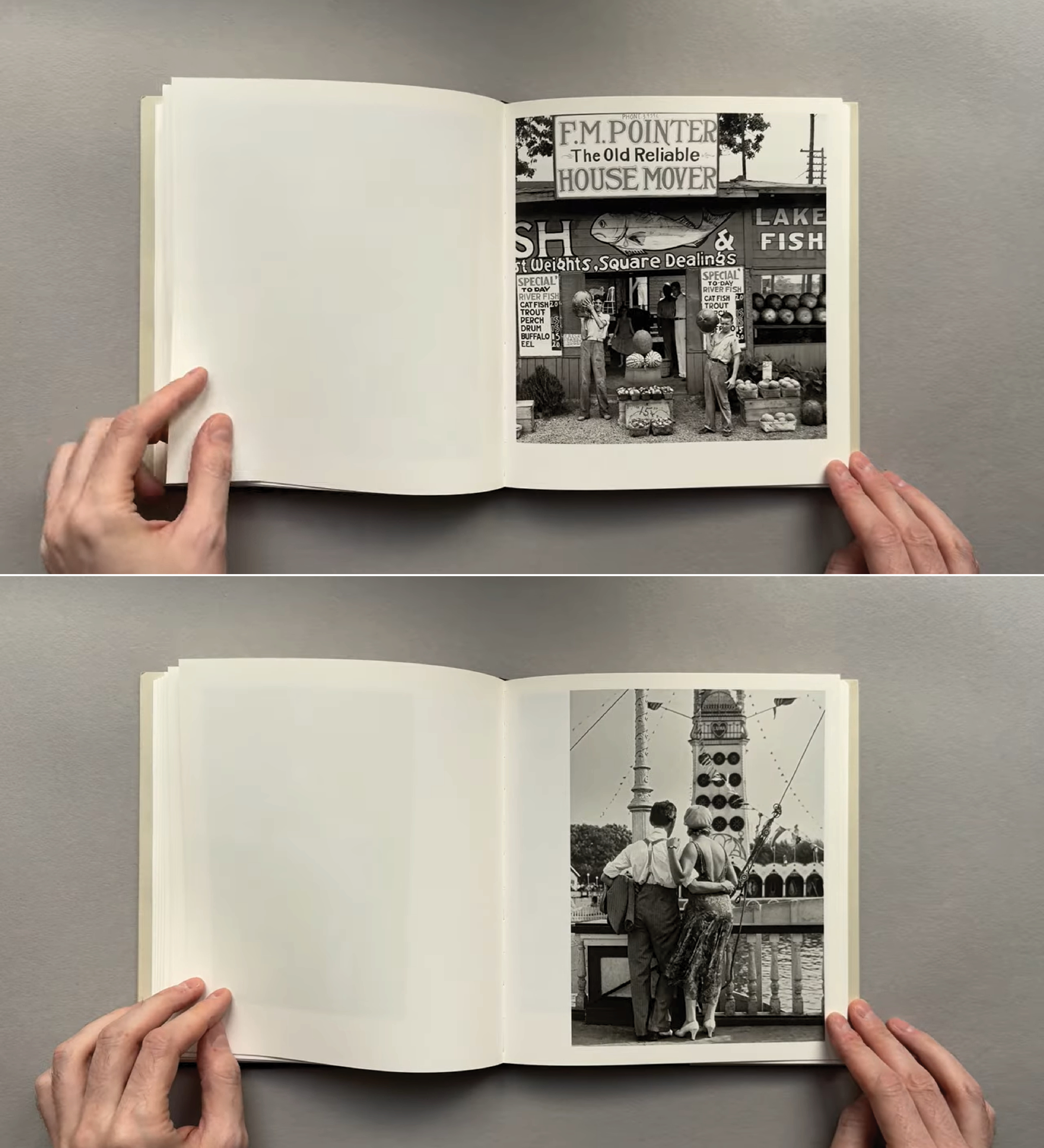 © EVANS, Walker. American Photographs. New York : The Museum of Modern Art, 1938. Digital Image, 2016 MoMA, N.Y.. La dixième, capture un couple conduisant une voiture. Nous le voyons, il relie subtilement des histoires entre elles à travers le sujet des photographies elles-mêmes. L’expérience du lecteur est donc considérée et en ce sens, American Photographs donne lieu d’une esthétique où la répétition devient un support implicite de la critique sociale. La mise en page s’appuie sur une grille qu’on devine grâce à l’unicité qu’on retrouve dans la succession des images. On retrouve systématiquement une photographie par page s’alignant horizontalement ou verticalement sur ce module. Cette disposition dynamique des images aère le contenu et cela avec une grande présence de marges. Le format du livre ne suit également pas la norme standard de livre photographique : la structure est compacte, ni trop étroite ni trop large, ce qui confère au recueil une identité propre grâce à sa liberté graphique.