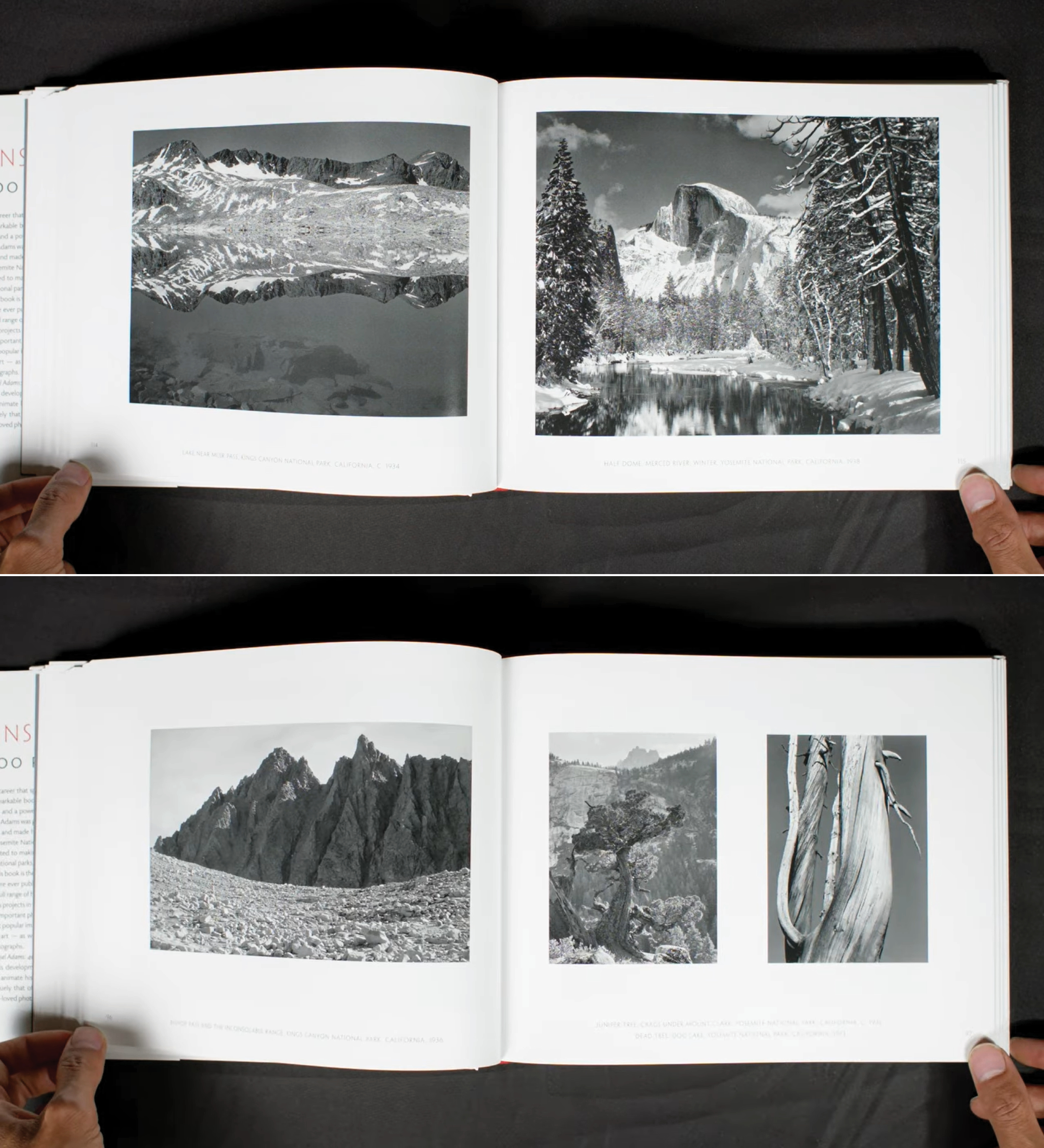 Il fait premièrement recours au Zone System11 qui garantit une gestion précise des contrastes durant la prise de vue, rendant chaque haute lumière parfaitement lisible. Cette méthode, développée par Ansel Adams et Fred Archer, vise à donner aux photographes un contrôle précis sur la manière dont les tonalités noires et blanches sont rendues. On le comprend, le choix du noir et blanc est choisi pour mettre en avant les textures, les formes et les contrastes, accentuant l’intemporalité de ses photographies. On retrouve cette vision dans 400 photographs12 qui présente l’ensemble de l’œuvre d’Adams en un seul volume[fig