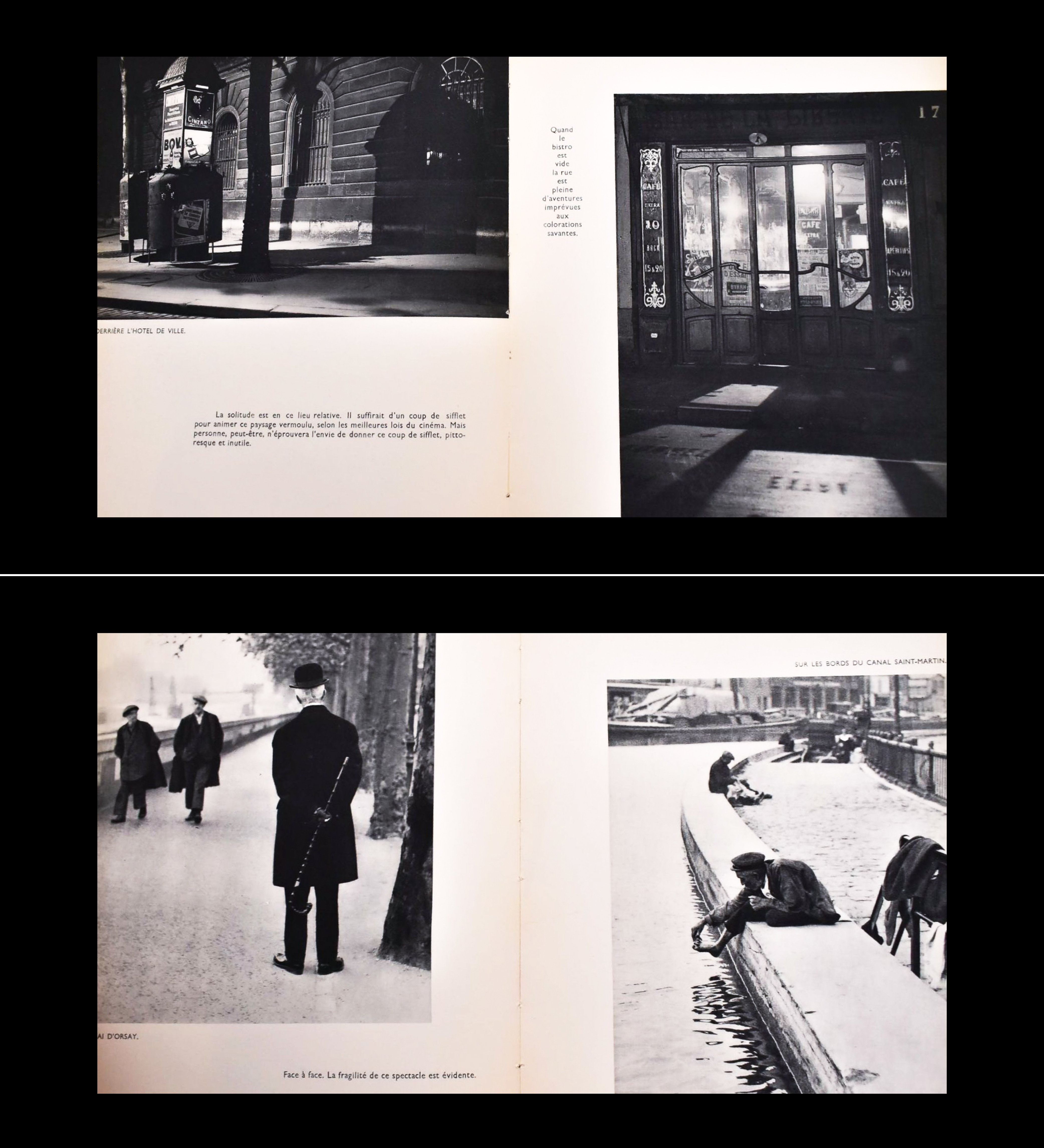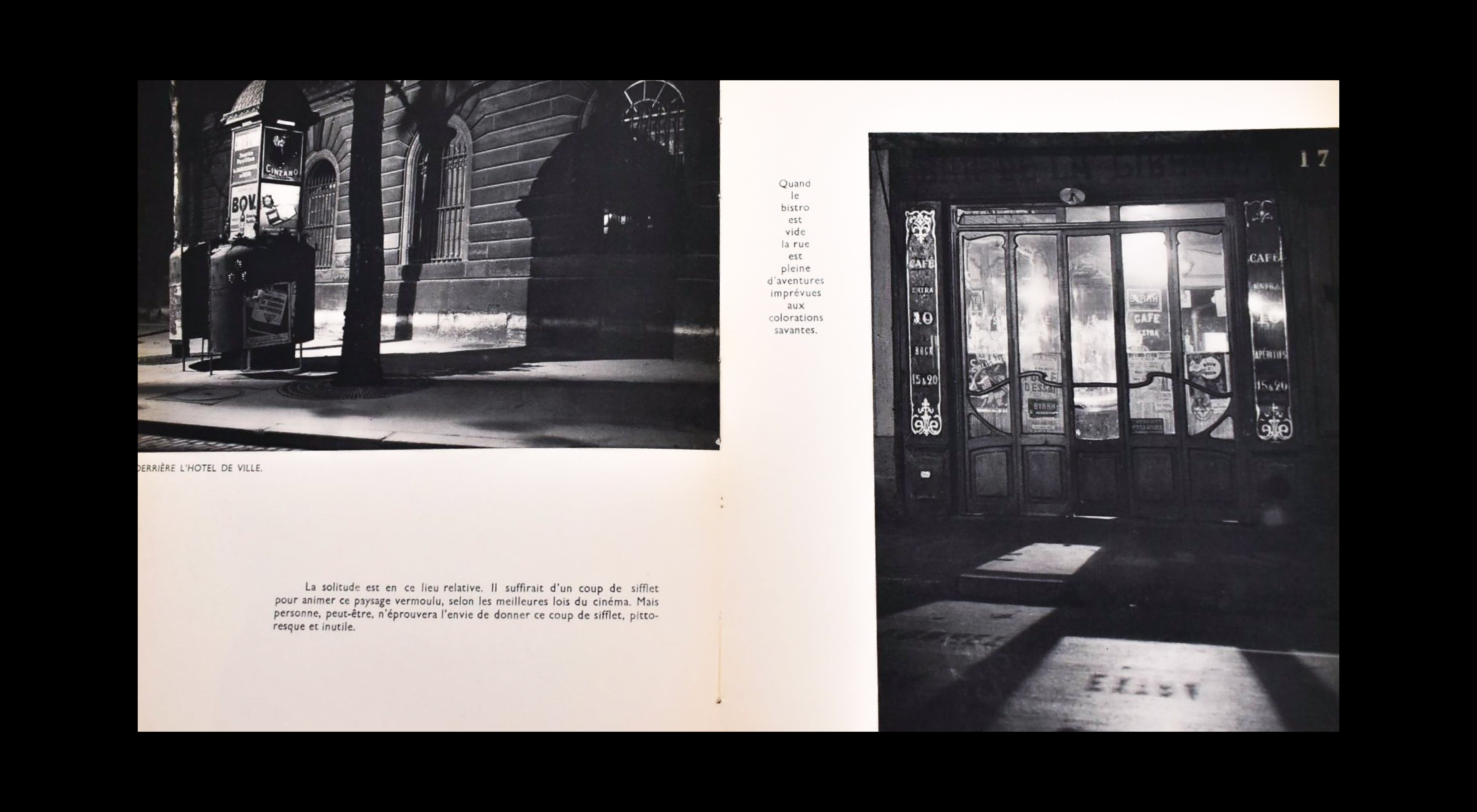 Nous le remarquons, les photographies, jusque-là épurées de tout ornement, prennent une nouvelle dimension ici. Les marges, bien que présentes, se fondent dans la composition, tandis que la moitié des pages est désormais recouverte de photographies, encadrées de textes subtils. Kertész révèle par ailleurs les éléments sensibles de la vie quotidienne à travers sa photographie le noir et blanc. Ses photographies ne se réduisent pas à une représentation du monde extérieur, mais correspondent bel et bien à une fenêtre ouverte sur une atmosphère texturée. Exemple probant avec la rue : il inscrit des ombres projetées sur le pavé, silhouettes floues, ou échantillons de rencontres furtives de passants, à l’écart de toute mise en scène, voire interprétation. Il introduit alors une réflexion invitant le regard sur la beauté insoupçonnée de l’ordinaire, d’une beauté que l’on ignore bien souvent au fil d’une existence survoltée.