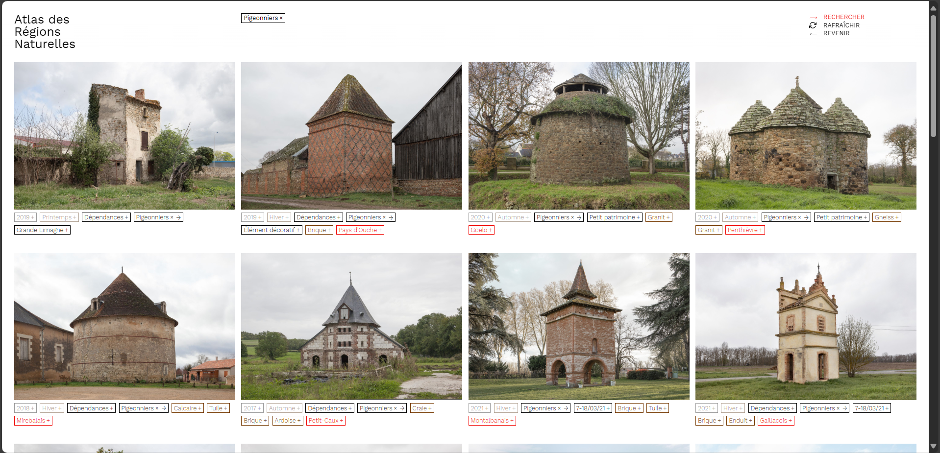Comme le Dictionnaire Le Robert39 le définit, l’archive est « la collection de documents rassemblés et classés à des fins de consultation ». Sur le site des archives de l’Atlas des Régions Naturelles, les photographies des différentes régions de France sont classées par entrée du paysage : « monument », « époque », « bâti » ou encore « toiture ». L’identité du site suit les codes graphiques des volumes précédemment évoqués : grilles de composition, concept de classification (pictogrammes) mais prolonge l’accessibilité via la carte de la France. Le principal chemin de navigation repose sur la sélection de ces thématiques que l’on valide par le bouton « rechercher ». L’outil suggère de faire accumuler et croiser des régions (carte) et/ou rubriques (index). Celui qui visite le site compose son propre parcours, selon ce qu’il veut explorer. Les correspondances possibles entre ces images sont infinies et par cela la lecture n’est plus linéaire.