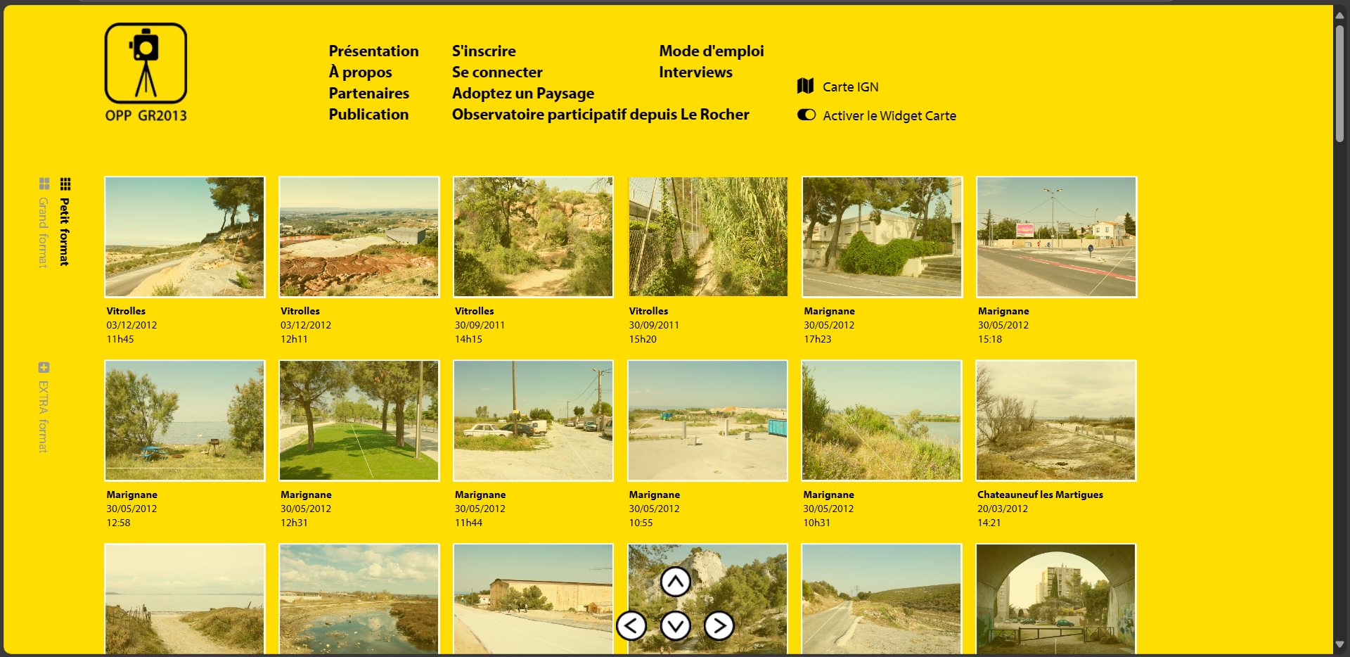Dans le mode d’emploi du site40Paysages Usagés (2012 – 2022) il est expliqué : « La grille permet de visualiser les points de vue de l’Observatoire. Une vignette en nuance de gris indique que le point de vue possède des reconductions et peut donc être développé afin de les visualiser. Les vignettes peuvent être visualisées dans différents formats (Petit, Grand ou EXTRA) qui sont sélectionnables via la barre d’outil verticale située à gauche de la grille. Les points de vue de l’Observatoire peuvent être localisés au sein du territoire via le module Carte, activable par le bouton « Activer Carte » du menu. Quand le module Carte est activé, lors de la sélection d’une vignette, une cellule contenant une carte avec un icône caractérisant la localisation et l’orientation du point de vue apparaît après un court délai. »