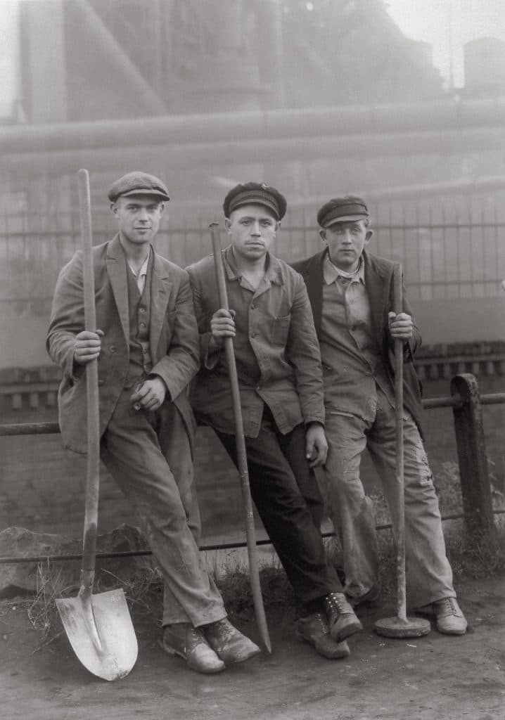 Photographies de SANDER, August. Cantonniers dans le Bassin de la Rurh, vers 1928. © Die Photographische Sammlung/SK Stiftung Kultur., il construit une représentation systématique de la société allemande de son époque. Son approche repose sur une composition précise : les personnages prennent des postures simples, souvent en lien avec leur environnement, ce qui donne à chaque image un caractère presque iconographique. Ce traitement neutre, sans emphase dramatique ni émotion, lui permet d’abord d’en dégager des similitudes structurelles au sein de ces groupes, révélant ainsi des types sociaux définis par leur fonction et leur rôle.