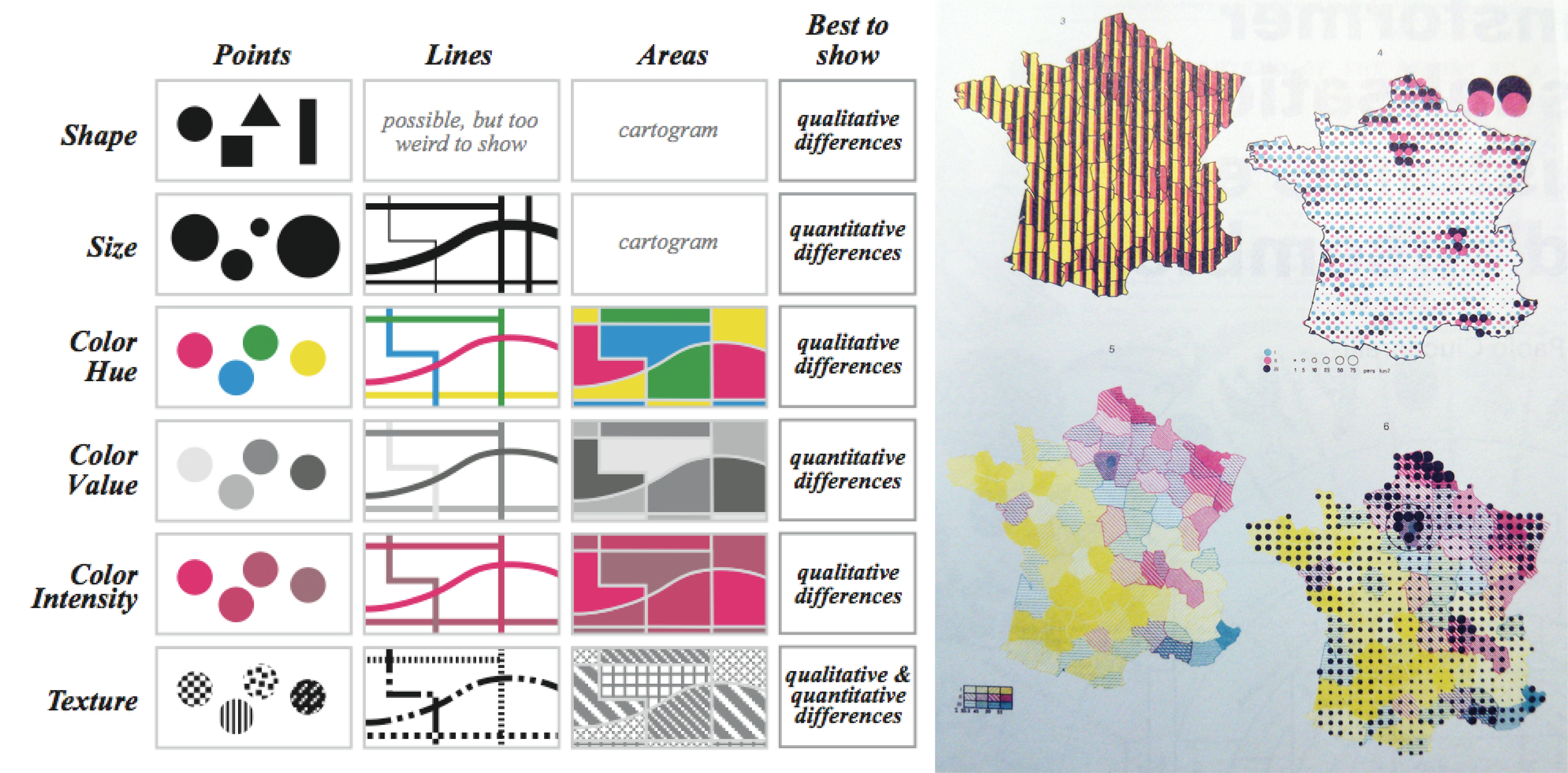 Il explique l’intérêt de chaque élément graphique sur une carte. La position est le point de repère fondamental. Elle détermine l’emplacement d’un élément sur l’espace graphique, organisant ainsi la lecture et l’orientation de la carte. Les différentes échelles des éléments représentés imposent une hiérarchie visuelle : un élément plus grand attire immédiatement l’attention et signale son importance relative. La forme, quant à elle, dessine des catégories distinctes en utilisant des symboles tels que des cercles, des carrés ou des triangles qui figurent des données de repères à l’utilisateur·ice. La valeur, avec son jeu subtil de clair et d’obscur, permet de signaler les intensités et les densités, offrant une perception nuancée des données. La couleur distingue et articule les ensembles. Chaque teinte peut marquer une catégorie, une émotion ou une signification particulière. L’orientation intervient pour basculer les symboles dans des directions variées. Elle suggère un mouvement ou un flux, donnant vie à l’espace représenté. Enfin, la texture, par ses motifs répétés, ajoute un vocabulaire nécessaire à la compréhension des cartes.