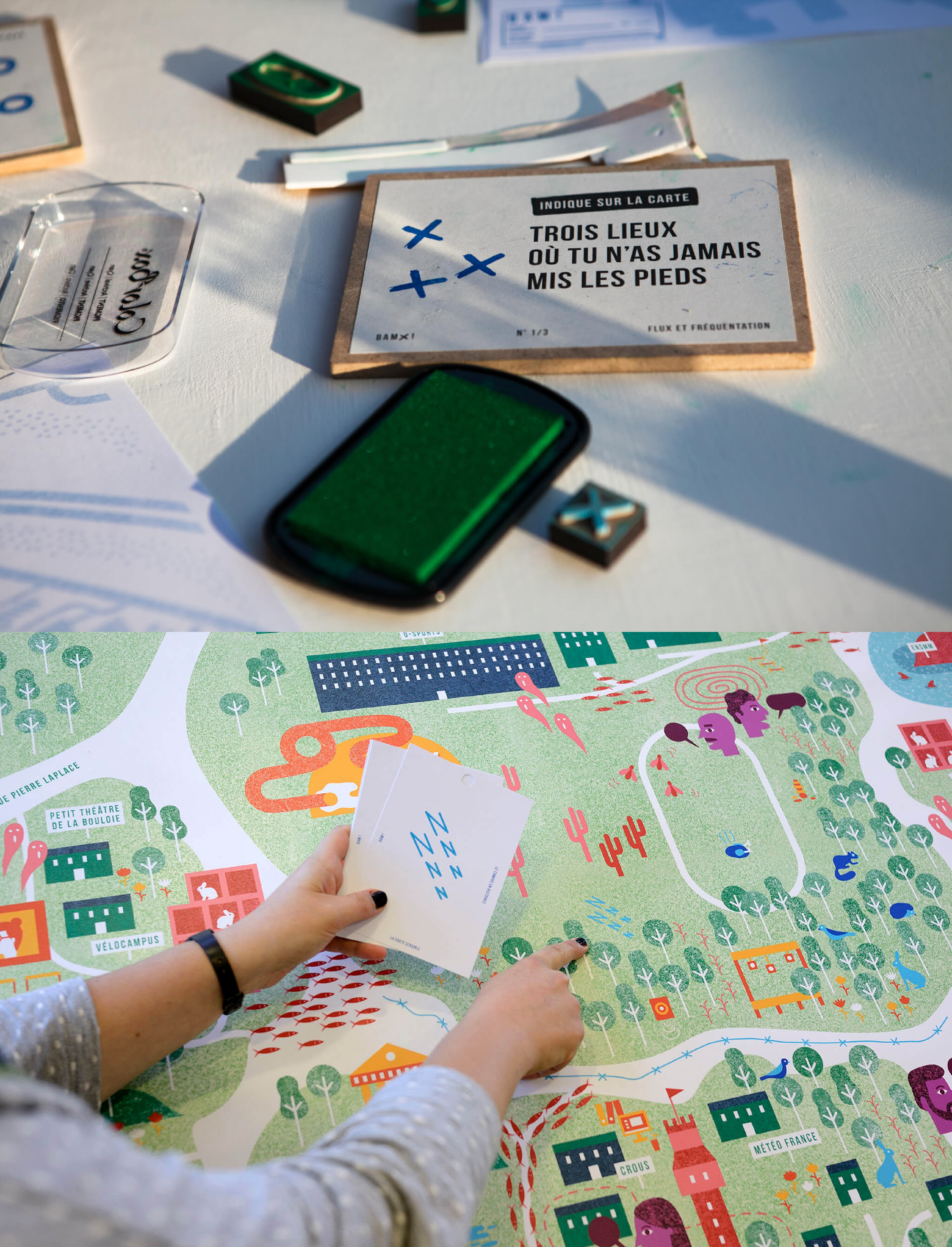La Bouloie en Agitation Maximum organisé par le collectif Terrain Vague (voir annexes). Conçu comme un cycle de résidences sur trois ans, il interroge les usages du territoire en impliquant étudiant·es, professionnel·les et habitant·es du quartier. Lors de la première année (2015–2016), le collectif de graphistes, composé de Marisol Abeilhe Godard, Elsa Varin et Ambre Langlois, a été invité à mener une série d’ateliers. Le projet avait pour objectif de recueillir les perceptions et les idées des usager·es du campus en se basant sur trois données : les flux et fréquentations, les points de vue et les projets d’utopie. Pour les flux et fréquentations les participant·es indiquaient sur une carte leurs trajets quotidiens, leurs lieux favoris et les zones moins fréquentées ; pour les points de vue, iels partageaient des anecdotes, des souvenirs et des opinions sur différents endroits du campus ; enfin, pour les projets d’utopie, chacun·e était invité·e à imaginer et décrire des aménagements idéaux pour le campus, en les situant sur le plan. Ces contributions ont conduit à la création d’une carte sensible du campus, reflétant les usages et les aspirations de sa communauté. Distribuée gratuitement à la rentrée universitaire 2016, cette carte a également été présentée lors d’une exposition itinérante, par la suite, l’étude a servi à améliorer la vie quotidienne des étudiant·es au quotidien. Ici encore l’unité graphique a été trouvée par les matériaux, principalement des tampons réalisés par le collectif et des rouleaux de peintures préalablement découpés avec des formes originales pour obtenir des empreintes différentes en fonction du rouleau choisi. Les choix graphiques sont plus restreints que pour « Ne rougissez pas » puisque la carte était déjà construite, il fallait y ajouter les informations, les couleurs et les codes graphiques.