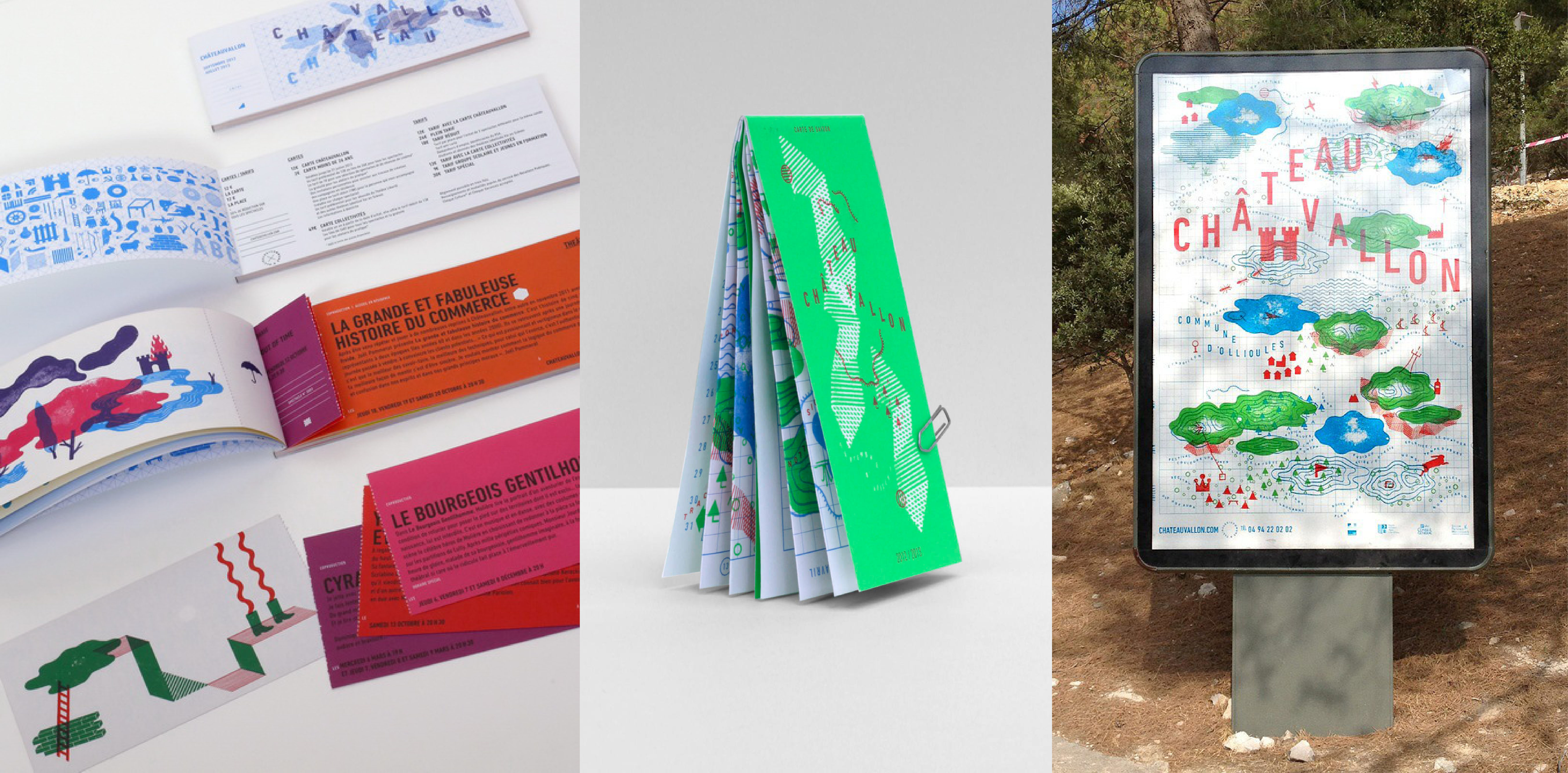 Ma première escale me conduit sur une île familière, celle qui m’a donné l’envie de partir à la découverte des cartes sensibles. Ici, je rencontre le projet Châteauvallon par Aurélien Débat, un illustrateur et graphiste né en 1979 en Alsace. Sa spécialité est de mêler illustration et architecture pour interroger l’espace urbain. En 2012, Nathalie Anton lui confie, avec Patrick Lindsay, la mission de repenser la communication visuelle du centre culturel de Châteauvallon. Leur objectif est de refléter l’originalité et le caractère singulier de ce lieu, tout en le démarquant de ses concurrents. L’offre culturelle de Châteauvallon, anticonformiste et exigeante, mêle créativité et accessibilité. Sur le plan éditorial, Nathalie Anton souhaite rompre avec les traditions : pas d’édito classique, des prix affichés directement, et un programme au format d’un chéquier. Débat et Lindsay élaborent alors un univers visuel hybride, qui associe héraldique, illustration poétique, bande dessinée, tampons illustratifs et cartographie. Iels font de Châteauvallon un « royaume culturel », où incectes, nuages, lettres et monuments se croisent. Dans ce projet, les fourmis sont aussi grandes que les bâtiments, jouant avec le principe d’échelle, c’est à dire que les deux éléments, pourtant très distincts, sont placés à la même importance. Ainsi la carte nous fait vivre l’expérience concrète d’une promenade à Châteauvallon, un lieu qui permet de tout autant profiter de la visite des infrastructures que regarder les arbres et les fourmis sur la route. Ce projet dépasse sa fonction informative pour faire ressentir au regardeur ou à la regardeuse ce que peut être réellement la découverte de Châteauvallon. Un élément remarquable dans le travail de Aurélien Débat est son utilisation de la trame, une méthode qui rappelle les motifs et hachures de la cartographie classique. Cette technique s’inscrit dans la tradition graphique évoquée par Jacques Bertin. Cependant, Débat se détache de l’utilisation pratique, il s’en empare pour des raisons esthétiques, créant des jeux intelligents avec les codes artistiques qu’il emprunte.