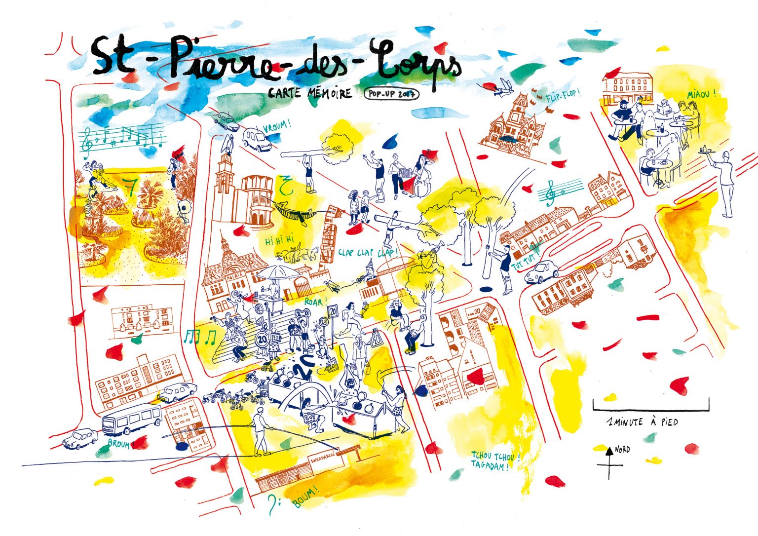 Illustration de Julien Rodriguez (voir annexes). Entre 2017 et 2019, dans le cadre du projet POP UP, un jeu de piste artistique conçu par le Tours Soundpainting Orchestra et Strike Anywhere, il explore des récits d’habitant·es. Les témoignages récoltés (anecdotes, légendes urbaines, contes du quotidien) prennent vie sous forme de performances improvisées par le collectif d’artistes de la scène, mais aussi à travers des dessins et des cartes. Dans ce projet les cartes racontent des histoires, mêlant orientation et désorientation. En explorant ces îles, on peut se perdre dans des récits qui révèlent des lieux où rire, déclarer son amour, ou simplement rêver.