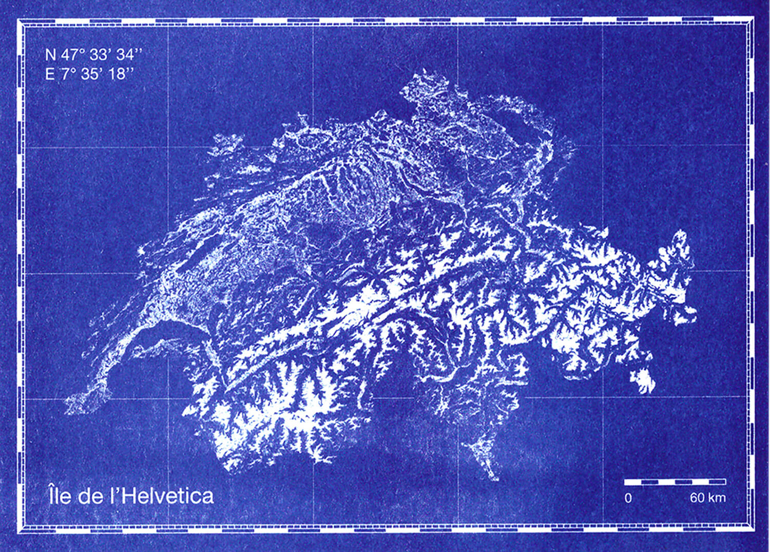 L’océan des Cents Typo par Malo Malo, designer graphique et illustrateur basé à Berlin. Il explore les polices de caractères à travers une série de podcasts et d’illustrations. Chaque épisode présente une font comme une île imaginaire, en racontant son histoire et ses spécificités à travers une narration poétique et ludique. Les illustrations accompagnent ces récits, traduisant visuellement les atmosphères évoquées pour offrir une expérience immersive et originale autour de la typographie. L’île de l’Helvetica prend la forme de la Suisse ; l’atoll de Blur s’entoure d’un épais nuage ; et le récif de Comic Sans, d’apparence hospitalière, se révèle rocailleux et dangereux. La carte, accompagnée du récit du navigateur Malo Malo, devient un moyen amusant d’en apprendre davantage sur la typographie. L’esthétique de cet océan est vraisemblablement inspirée de la diazographie, un ancien procédé de reproduction de plans, produisant des dessins bleus sur fond blanc grâce à un processus utilisant l’ammoniaque3. Le clin d’œil de Malo Malo est alors très intelligent puisqu’il nous renvoie directement à des souvenir lointains.