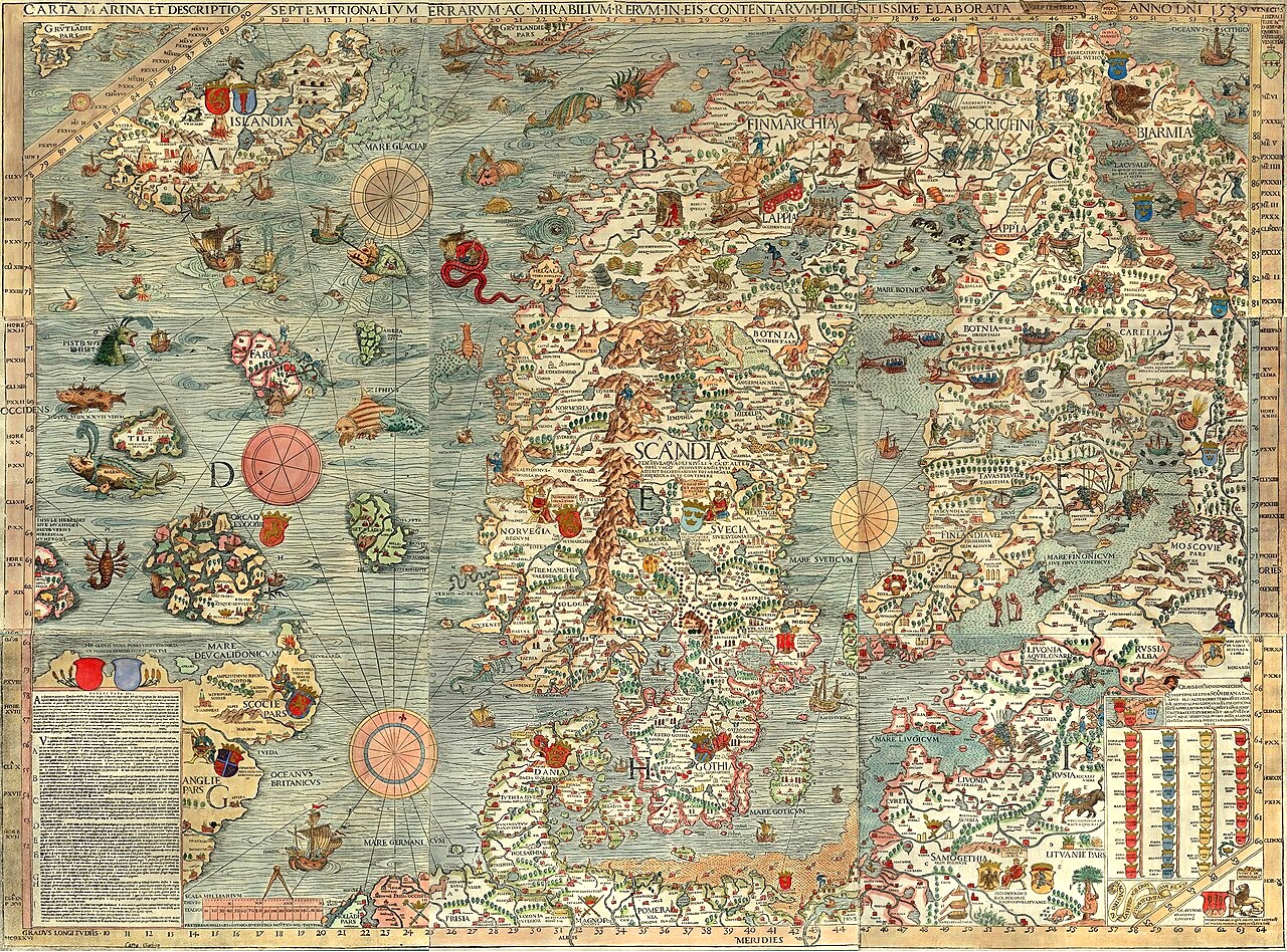 Par chance, lors de mes explorations, je découvre une fascinante carte : l’œuvre d’Olaus Magnus, la Carta Marina