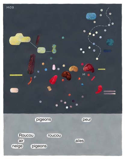 Martine par Jochen Gerner, illustrés par Marcel Marlier pour les éditions Casterman. Pour Tintin il ne garde que les mots, cartographiant le placement des bulles dans la page. Pour Martine les formes obtenues deviennent la cartographie d’aires de jeu onirique, qu’il exposera au centre d’art contemporain de l’Onde à Vélizy-Villacoublay lors de l’exposition Aires de Jeux.