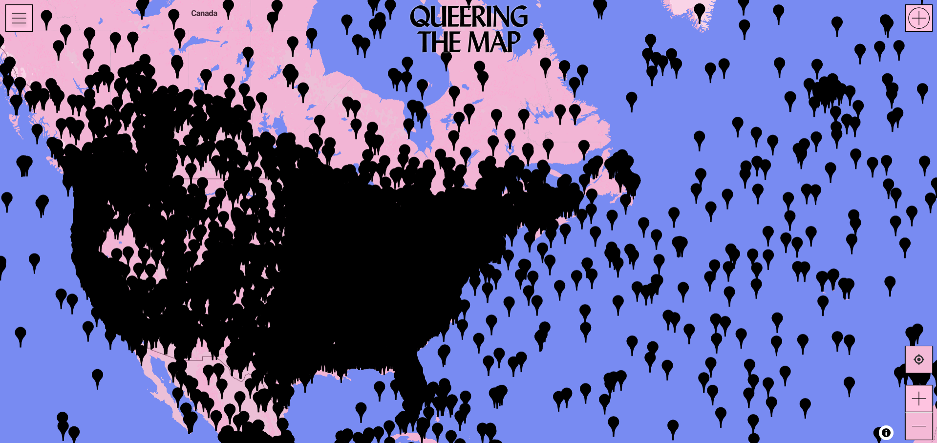Queering the Map par Lucas LaRochelle (voir annexes) est une carte interactive qui recueille des récits anonymes d’expériences LGBTQIA+ à travers le monde. Les utilisateurices peuvent ajouter une épingle sur la carte du monde et y associer un texte, formant une archive collective pour les visibilités des vécus queer. On y raconte premiers baisers, moments de résistance, lieux de joie ou de douleur. Queering the Map est un espace de mémoire et de solidarité qui permet symboliquement aux LGBTQIA+ l’espace qui leur a été interdit en dehors de la carte. Le graphiste a opté pour une base de carte minimaliste, probablement construite avec une API2 comme OpenStreetMap ou Google Maps, utilisant des éléments géographiques simples pour éviter de distraire l’utilisateur. L’interactivité (zoom, déplacement sur la carte, liens cliquables) est également imprégnée de la qualité graphique propre à Google Maps. Queering the Map adopte un code couleur rose, une teinte symbolique de l’homosexualité depuis la Seconde Guerre mondiale et le triangle rose. Toutes les histoires sont représentées par des marqueurs noirs, inspirés du point de Google Maps, qui s’illuminent en rose lorsque l’on passe la souris dessus. Ce champ de points noirs crée un effet de constellation, évoquant la communauté tout en préservant l’anonymat.