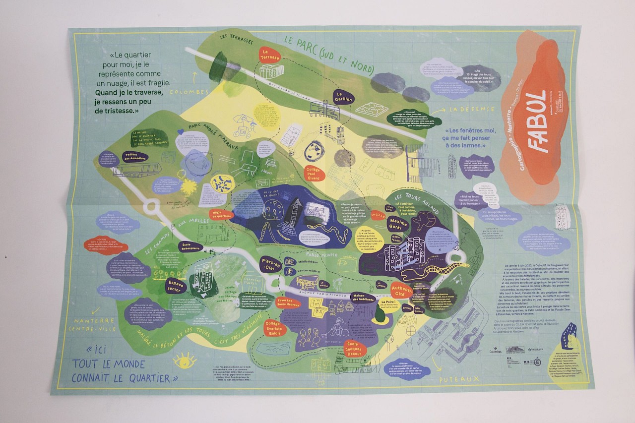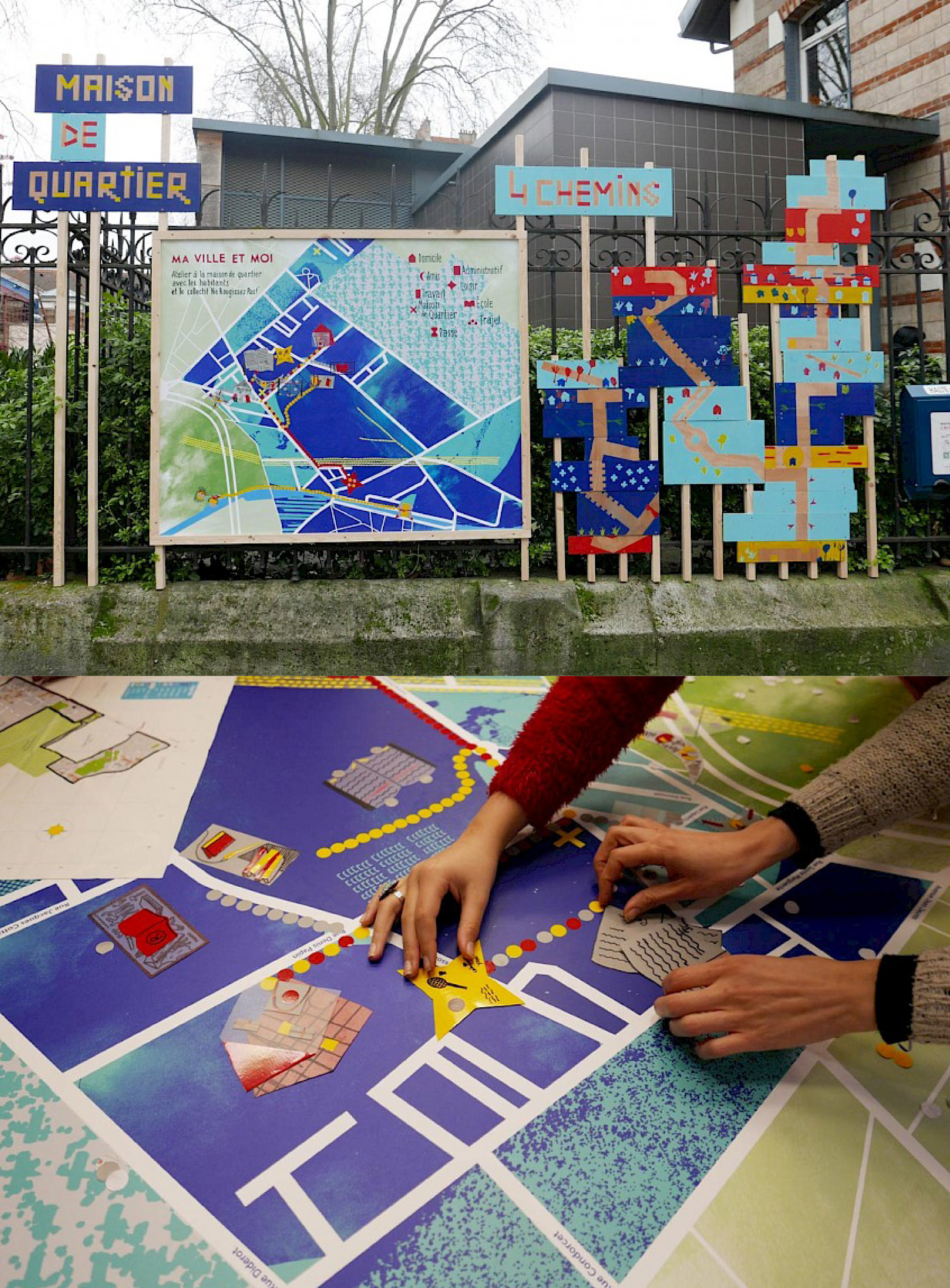 Ma ville et moi, organisé par le collectif « Ne rougissez pas » (voir annexes), en collaboration avec la Maison de Quartier des Quatre Chemins à Pantin. Ce projet visait à rendre ce lieu plus visible et mieux intégré au sein de la ville, en invitant les habitant·es à explorer et redéfinir leur quartier. Lors de ces ateliers participatifs, les participant·es ont décrit leur environnement, repéré ses particularités, se le sont réapproprié et en ont offert une lecture sensible. Ensemble, iels ont conçu une signalétique originale pour la Maison de Quartier, aboutissant à un ensemble cohérent comprenant un livre leporello, des symboles, des panneaux en bois assemblés en une grande cartographie, des affiches et des fiches de souhaits pour l’avenir. Ce processus a non seulement renforcé le lien entre les participant·es et leur quartier mais a aussi permis aux passant·es de découvrir le lieu et de contribuer à une signalétique proche de leurs ambitions. Le design final, malgré un travail à plusieurs mains est très harmonieux. Cela est permis grâce aux couleurs et outils imposés par le collectif : pochoirs, rouleaux de peinture, supports de bois… Le rendu est très spontané et vivant, s’adaptant aux goûts des participant·es. Ainsi, l’intérêt de « Ma ville et moi » a été de créer un lien entre les humain·es, leur ville et leurs choix graphiques, rendant la carte plus fidèle à la réalité des usager·es du quartier.