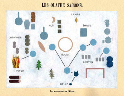 Les quatre saisons par Jochen Gerner, une série de quatre dessins représentant, comme son nom l’indique, les saisons. Pour ce projet, il établit une typologie des éléments caractéristiques de chaque trimestre. Par exemple, l’automne est symbolisé par des nuages lourds, du raisin, un tronc dépourvu de feuilles, le crépuscule, un panier de cueillette pour les champignons, et des teintes automnales. En disposant ces éléments à plat, il construit une sorte de carte géographique à partir de ce qui ne l’est pas.