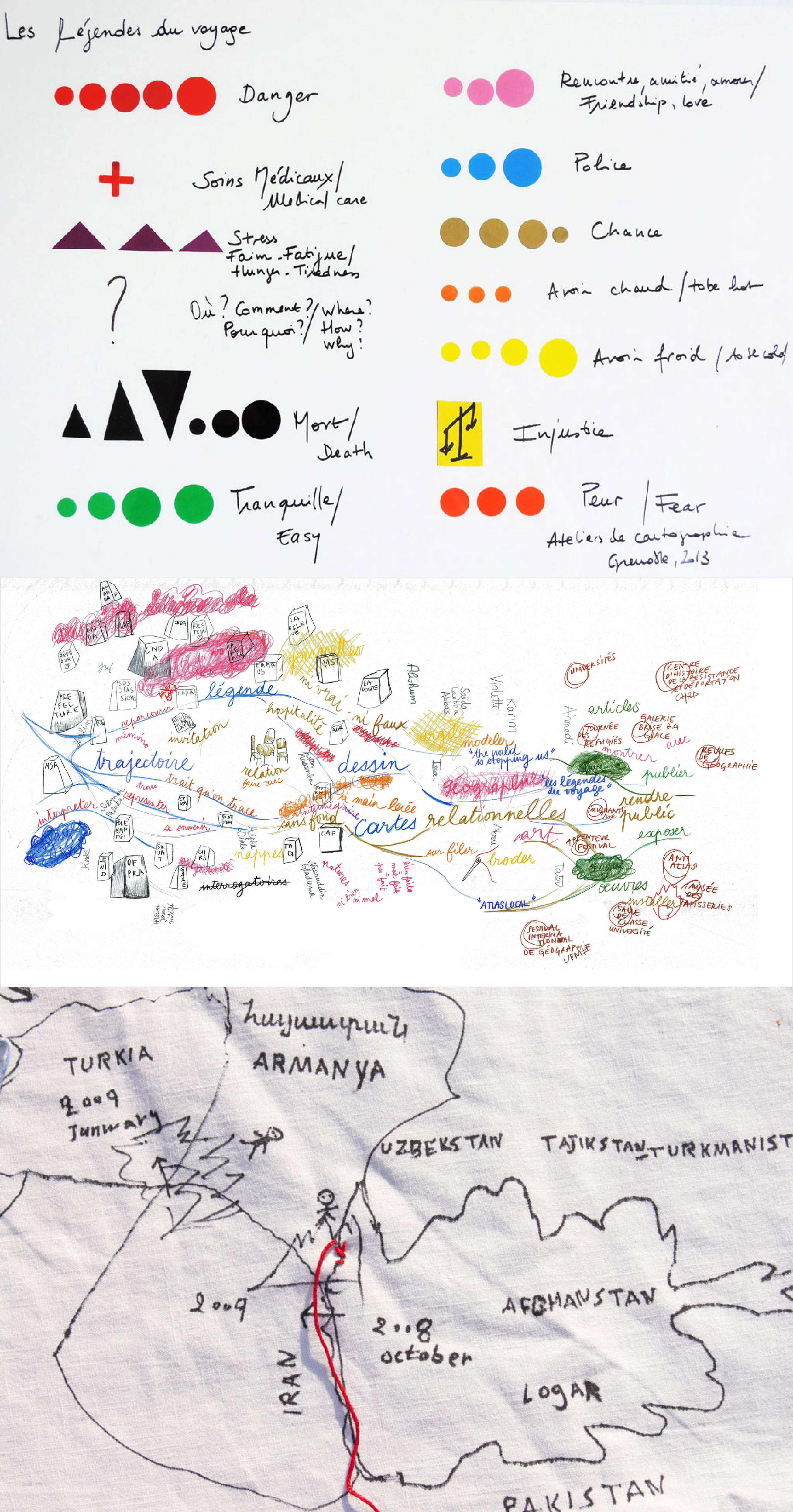 Cartes dessinées par Sarah Mekdjian (voir annexes) découvertes au sommet d’une colline. Son travail fusionne géographie, art et récits personnels pour redéfinir le rôle des cartes dans notre compréhension des territoires et des expériences humaines. En s’écartant des conventions cartographiques traditionnelles, Mekdjian donne la parole aux voix marginalisées, en particulier celles des communautés invisibles pour la cartographie classique. Les œuvres de Sarah Mekdjian se distinguent par leur approche graphique abstraite et sensible, s’éloignant des conventions géométriques et des symboles traditionnels. Ses cartes, faites à main levée, sont à la fois brutes et pleines de caractère. Ces créations ne cherchent pas à reproduire une réalité géographique, mais à traduire des expériences humaines intimes et collectives. Elles intègrent souvent des illustrations oniriques ou s’integre dans des projets participatifs, réalisées avec des migrant·es et des personnes issues de communautés marginalisées. En mettant l’accent sur les perceptions subjectives, les mémoires et les émotions liées aux espaces, elle expose aussi les rapports de pouvoir qui façonnent ces parcours, elle remet en question les cartes institutionnelles qui réduisent les migrations à des flèches représentant des flux. En ce sens, ses œuvres incarnent la cartographie radicale et sensible en assumant un tracé sortant de l’ordinaire, un parallèle intéressant lorsqu’on parle de marginalisation des individues.