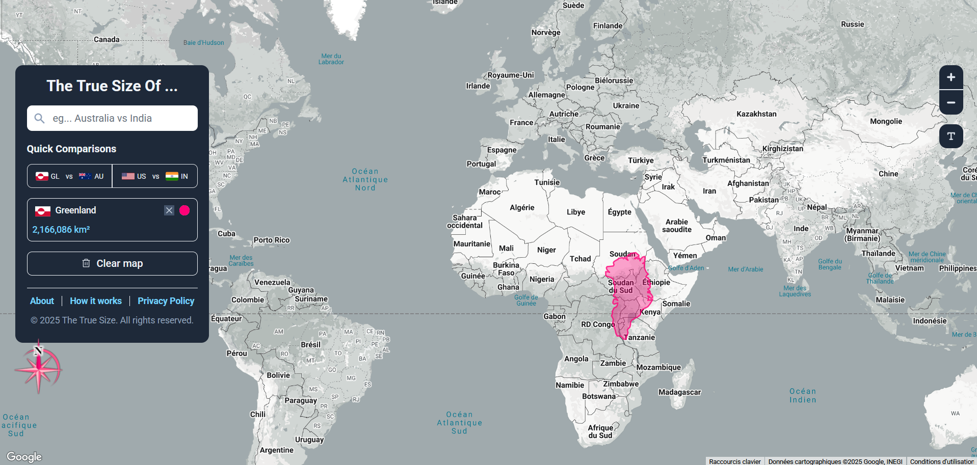 Je parle ici de légitimité géographique, mais je questionne la légitimité morale de la projection Mercator en raison de ses biais racistes. Elle minimise la taille de l’Afrique, la rendant visuellement bien plus petite qu’elle ne l’est réellement, comme si ce continent n’était pas si important. À ce sujet, il existe une autre représentation du monde à plat qui tente de respecter les tailles des territoires : la projection Bertin, imaginée par Jacques Bertin. Il la décrit comme « projection à compensation régionale, où la compensation n’est plus homogène, mais recherchée dans une plus grande déformation des océans, au bénéfice d’une moindre déformation des continents. » Chaque projection reflète des usages spécifiques. Une autre manière de comparer la taille des territoires est d’utiliser le site The True Size. Ce site, basé sur la projection Mercator, permet de déplacer les contours des pays pour les superposer entre eux et révéler leurs tailles réelles. On y découvre, par exemple, que le Groenland, souvent représenté comme immense, a en réalité la même superficie que l’Algérie, et non celle de l’Afrique entière. ↩︎