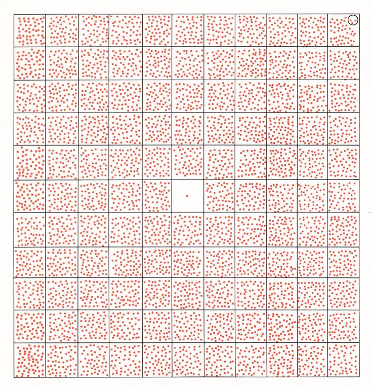 La carte se présente de manière très schématique, sous la forme d’un tableau composé de 11 colonnes et 11 lignes, rempli de petits points rouges. La légende, élément clé pour saisir son message, indique : « Le point rouge isolé au centre symbolise à lui seul la puissance de feu de la Seconde Guerre mondiale. Tous les autres points rouges représentent la force de frappe des armes nucléaires existantes. Le cercle en haut à droite illustre les armes transportées par un seul sous-marin Poséidon, dont la puissance équivaut à celle de trois guerres mondiales. »4. En lisant cette légende, un frisson me parcourt l’échine. Elle donne à voir, d’une manière brute et percutante, l’ampleur démesurée de la menace que représentent ces armes. William Bunge dédicace cette carte « aux enfants, de la part de leurs géographes. », une manière de questionner le monde que nous laissons aux génération futures.