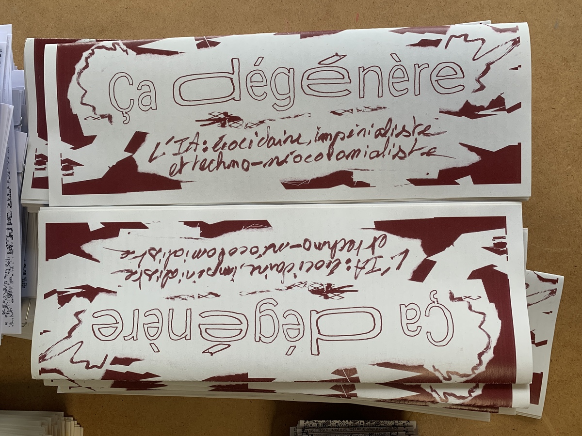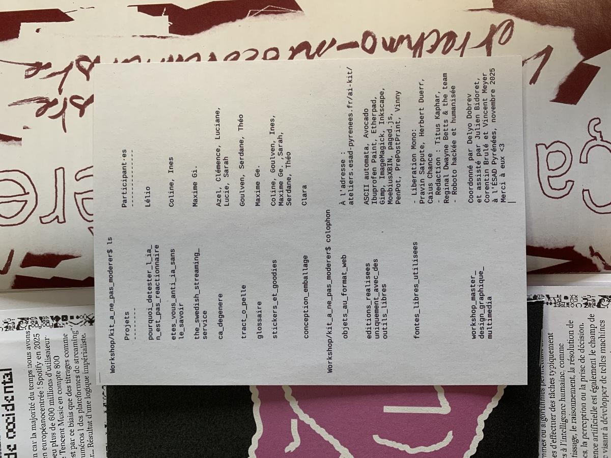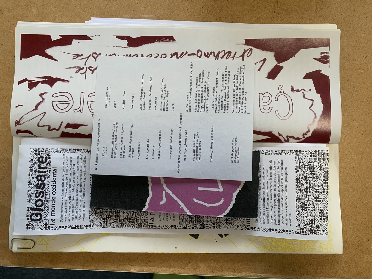 Delyo Dobrev, designer graphique et développeur, a accompagné les étudiant·es dans un temps de travail collectif autour de la fabrique d’un projet éditorial tendu entre ces deux enjeux majeurs de notre temps que sont l’IA et la montée du technofascisme.Mise en pages web to print :